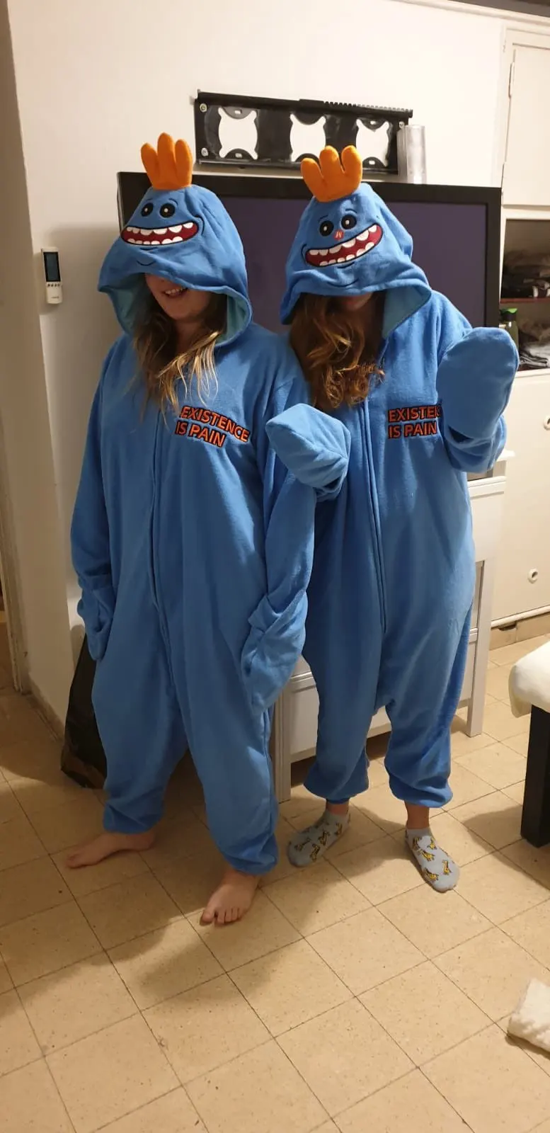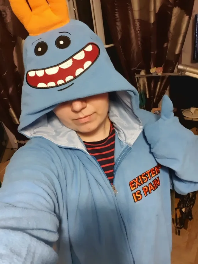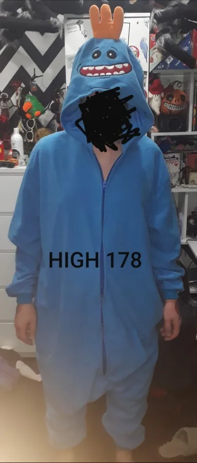 Купил M и был действительно великолепен для моей подруги, которая имеет 1,62m. Меньше было бы лучше. Ей понравилось, потому что г-н Meeseeks-это Idol it haha Просто не ставьте 5 звезд, потому что общий материал выглядит фланелевой. Не так мило, как купила другая свинья. Доставка занимает более 1 месяца.
