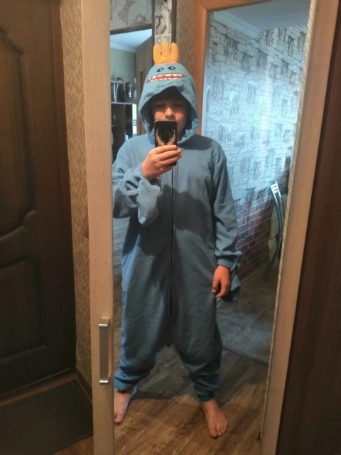 Очень хорошая кигуруми за свои деньги. На рост 170 брала XL (чтобы можно было без проблем задрать руки вверх и штаны не ползли следом. Флис тоненький, подклад в капюшоне и манжеты на щиколотках тоже из жиденького материала, но швы качественные + застёгивается на хорошую пластиковую молнию. Попа не на застёжке, так что в случае нужды нужно расстёгивать комбез целиком. Но лично для меня это не критично.