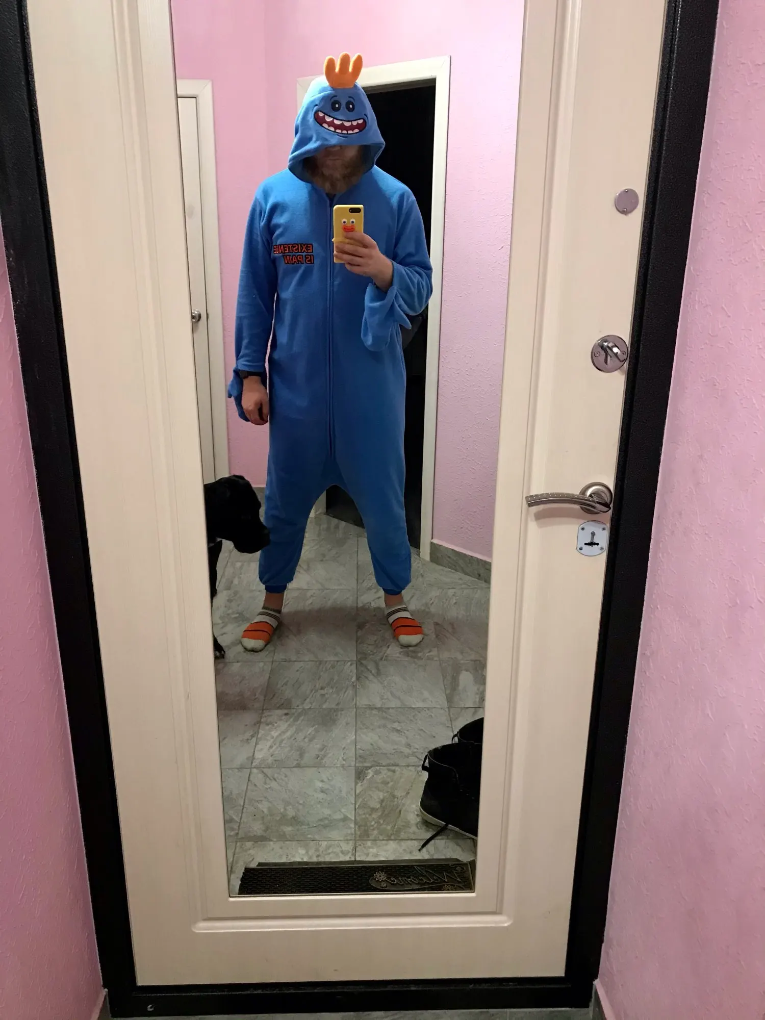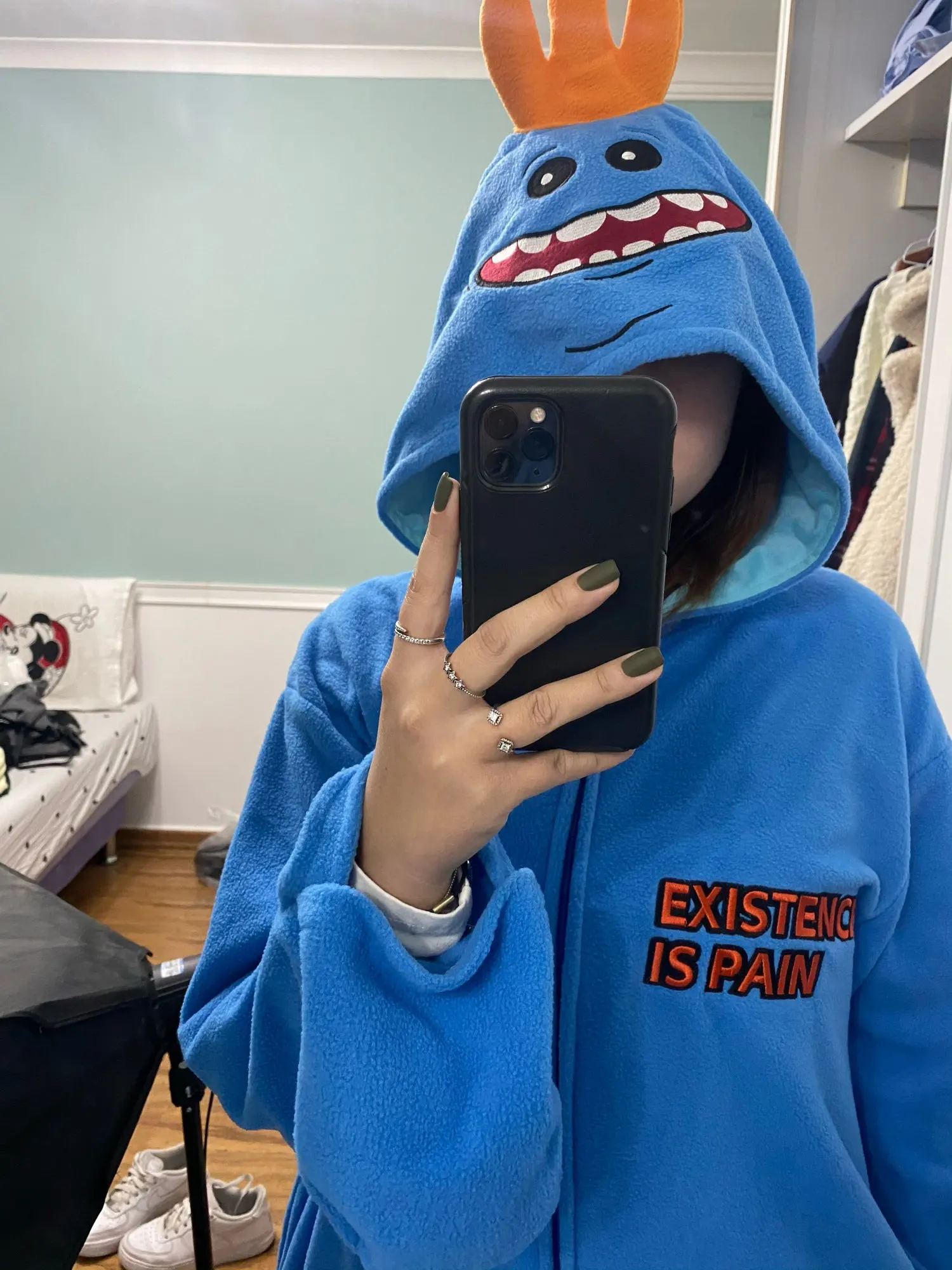 Я взял слишком большой Размер, я взял L, я должен был взять M (я 1m68,53 кг), рукава слишком длинные, и это очень свободный эффект lol. Но я счастлив, что даже продукт соответствует описанию, я мистер Meeseeks сейчас, посмотрите на меня!