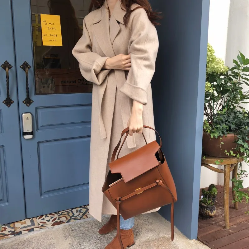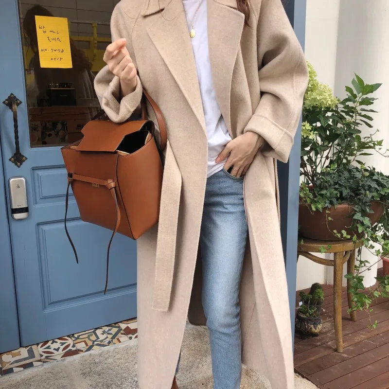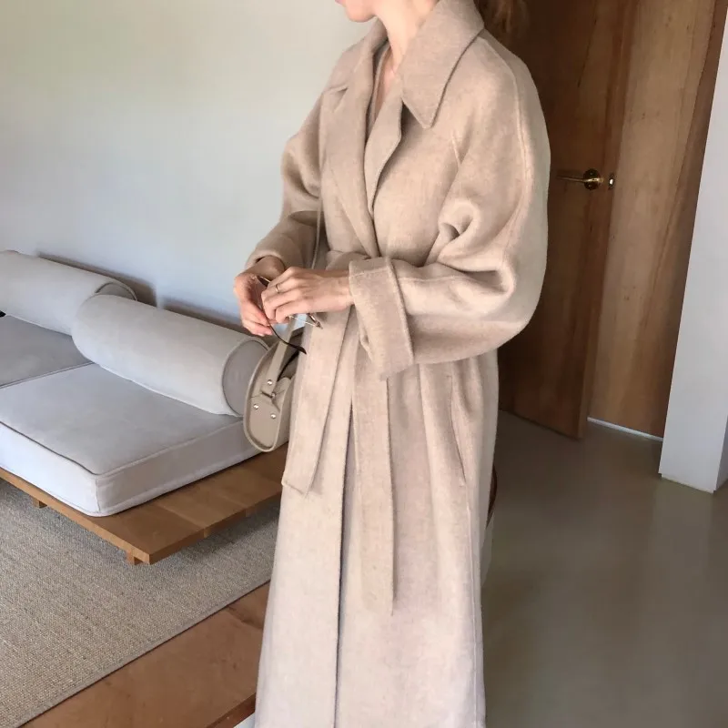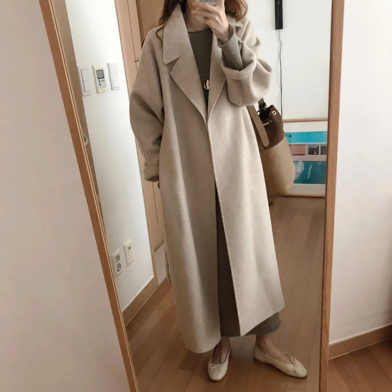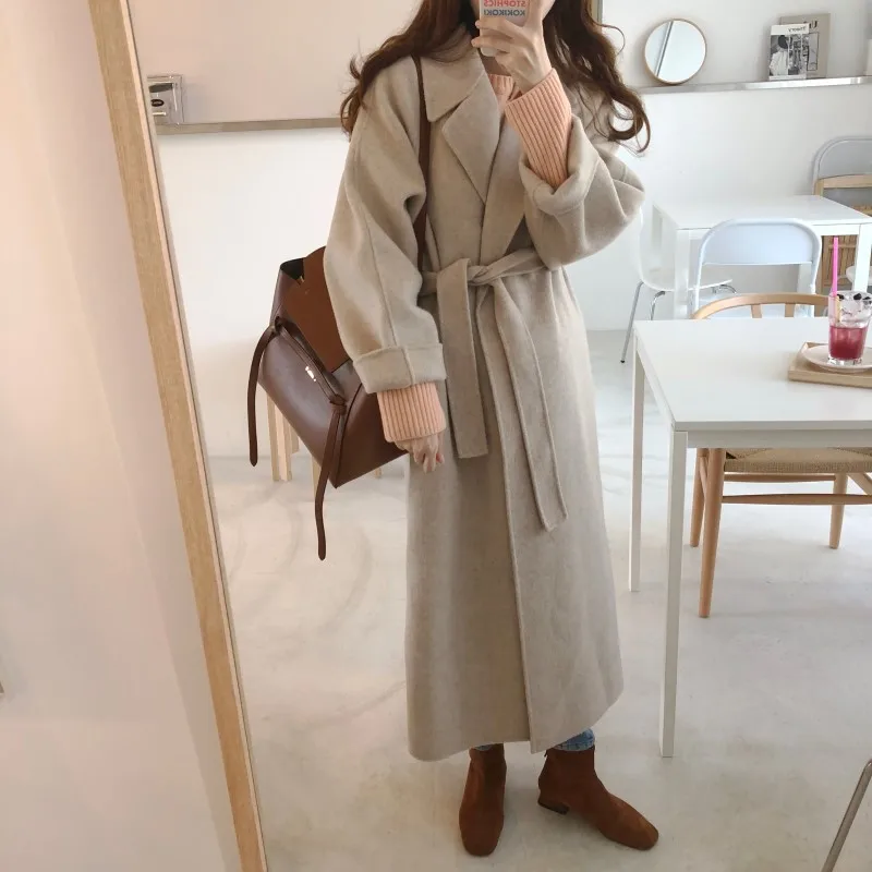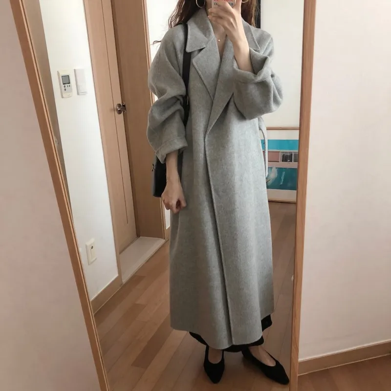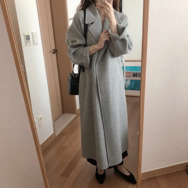 Осенне-зимний Новый Женский Повседневный полушерстяный Тренч оверсайз длинное пальто с поясом кашемировая верхняя одежда