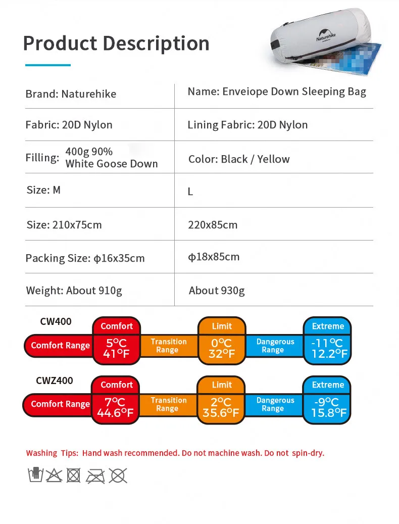 Спальный мешок Naturehike 550FP CWZ400, 90% гусиный пух, наполнитель, конверт, зимний, теплый, для кемпинга, для путешествий