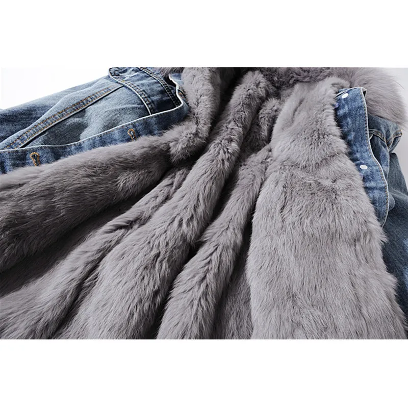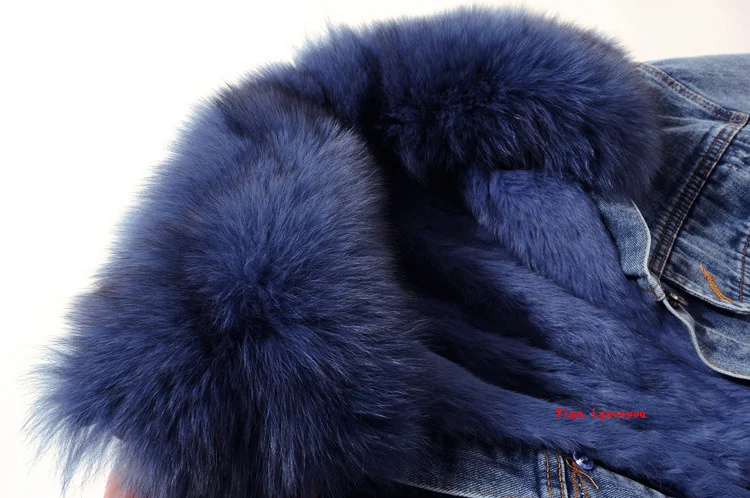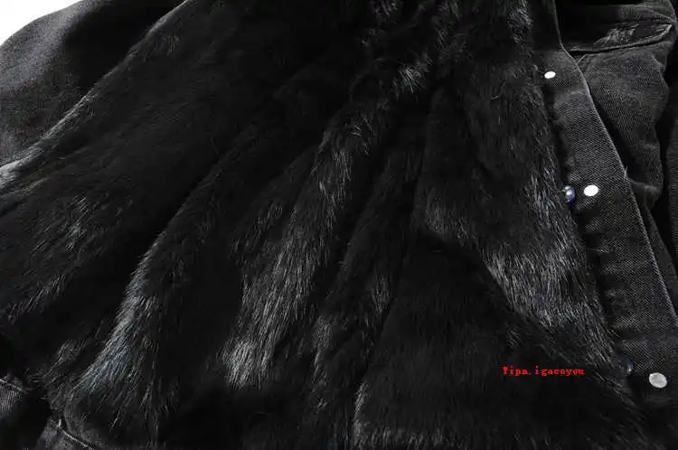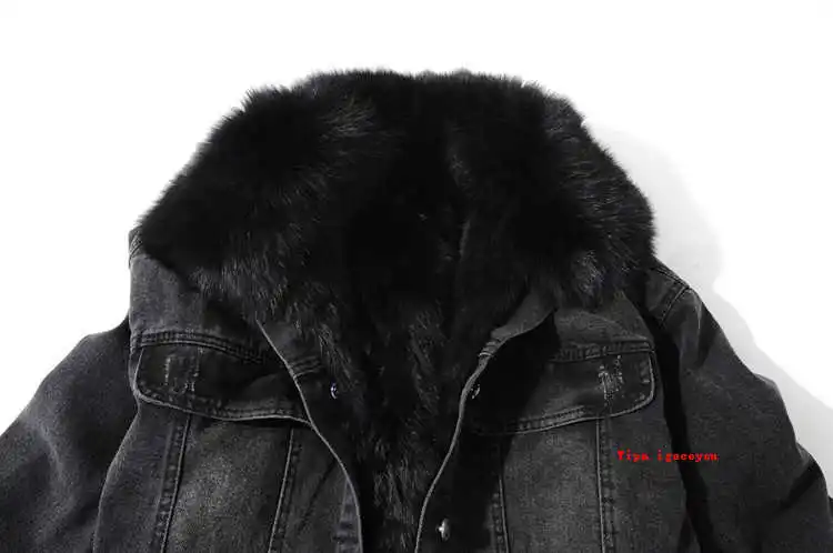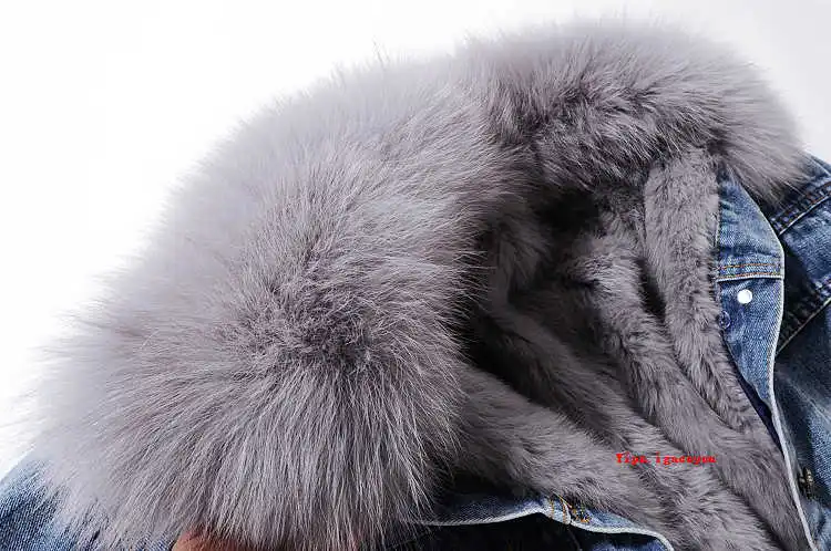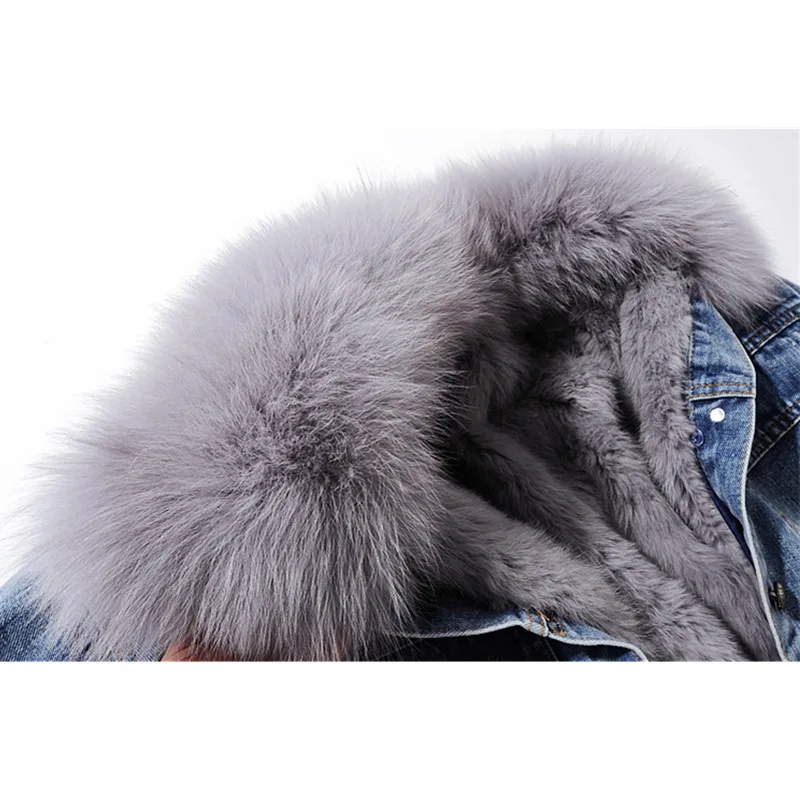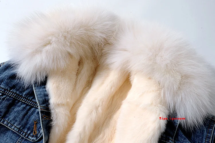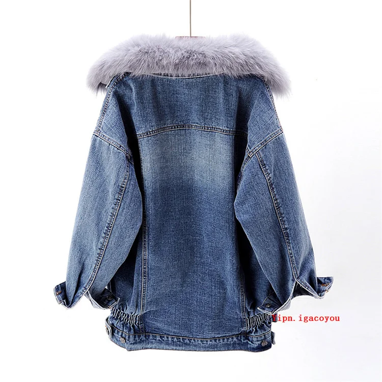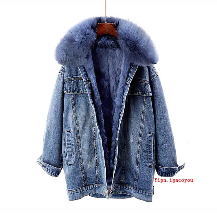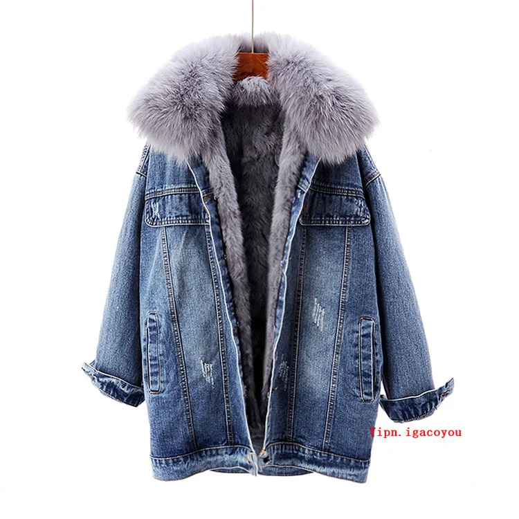 Женская джинсовая куртка с меховым воротником, зимняя Толстая теплая джинсовая куртка с воротником из лисьего меха и подкладкой из кроличьего меха, Повседневная Свободная короткая куртка для женщин, 6 цветов