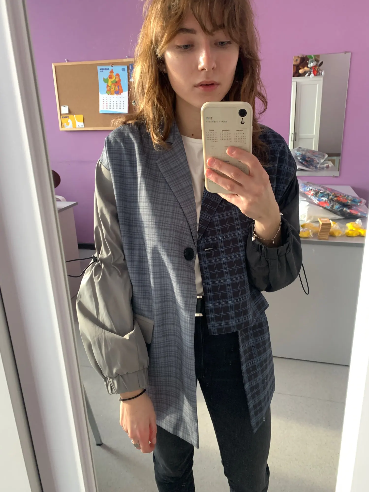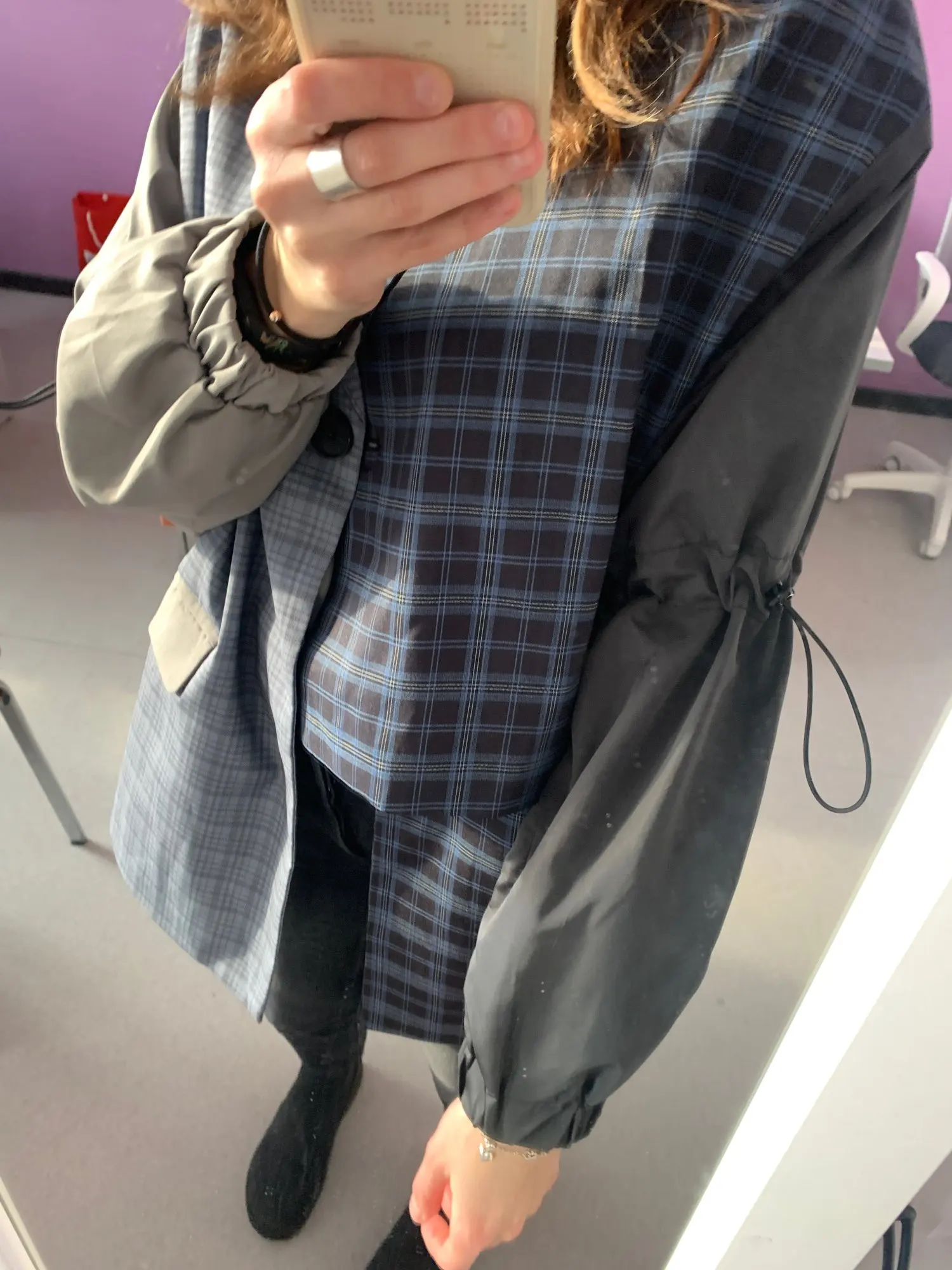 симпатичный блейзер, синтетика, ткань как плащевка, жёсткая. я думала, что из этой ткани только рукава, но оказалось, что вся куртка. это конечно минус, ещё ожидалось, что он будет более длинный. на ширину груди 118 сел в притык. Бирка ЕАМ отсутствует.