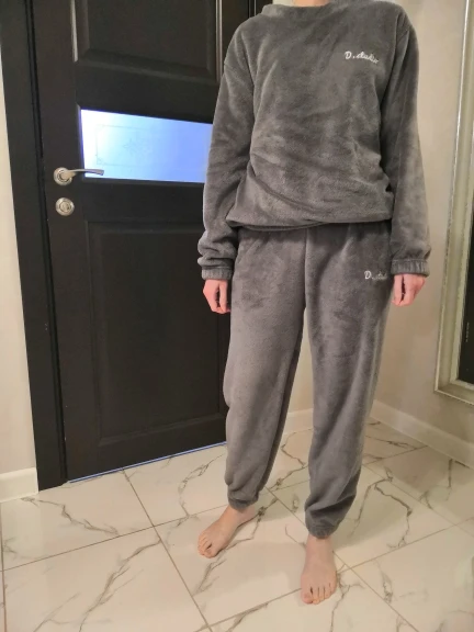 Отличная пижамка,теплая и мягкая. На размер 40-42 кофта конечно большая, настоящий оверсайз, а вот штаны сели хорошо(свободно и комфортно). Швы ровные, ниток нет, доставка очень быстрая, чуть больше недели до Московской области. Продавец отвечает на сообщения быстро и по моей просьбе поменял цвет заказа. Рекомендую к заказу.Чуть позже добавлю фото.