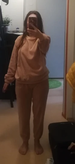 Суперская, очень мягкая и приятная к телу. Штанишки подзадираются на рост 165 (выше щиколотки становятся в процессе ходьбы, но не мешает). Рукава я ношу подтянутыми, не сползает. Мне лично не совсем нравится резинка на низе кофты. Было бы лучше без нее. В ней очень тепло и приятно. Рекомендую к покупке невысоким девушкам.