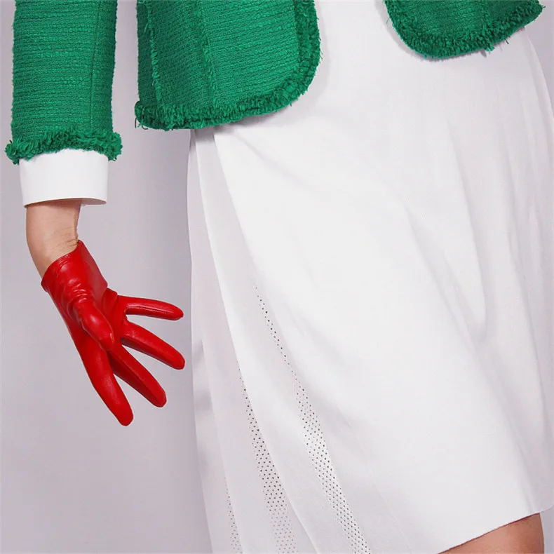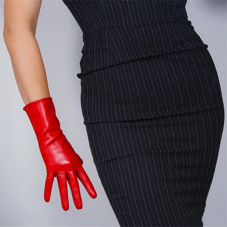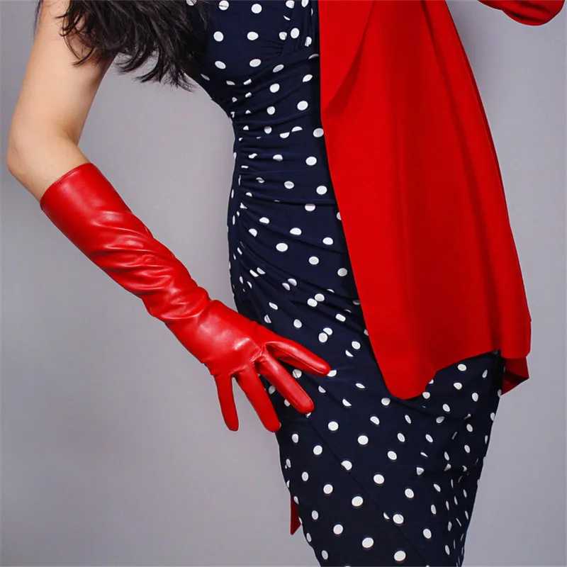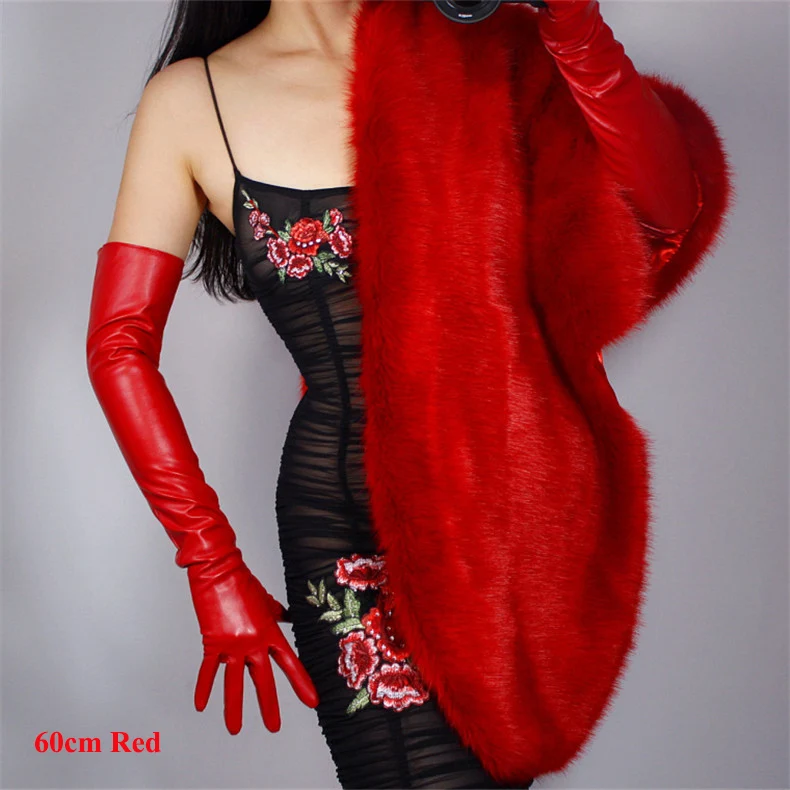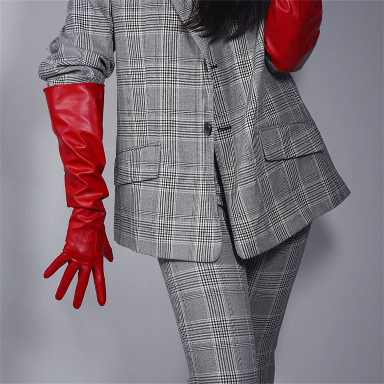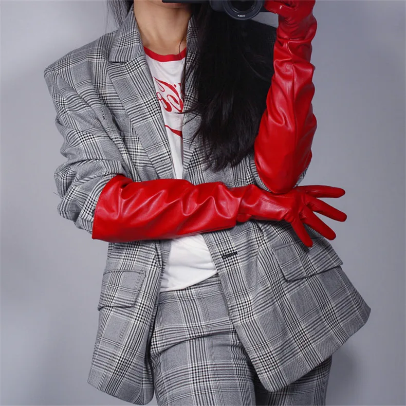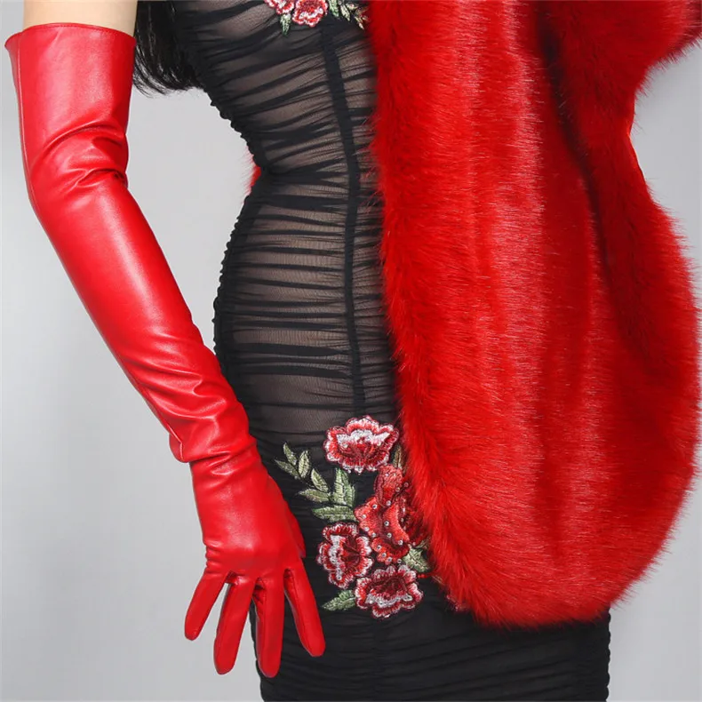 Удлиненные кожаные женские перчатки 70 см с налокотниками из искусственной овчины, женские перчатки без подкладки, модные красные WPU54