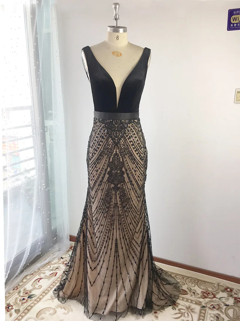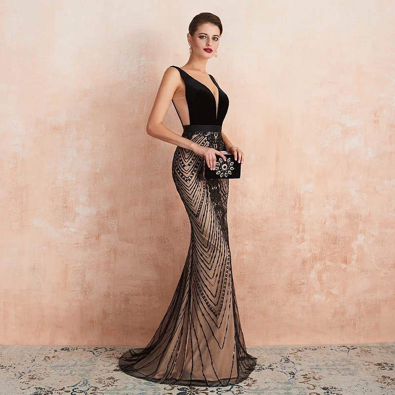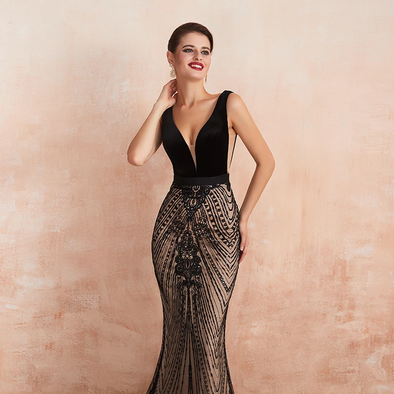 Женское вечернее платье с открытой спиной, черное платье до пола с V-образным вырезом и кружевной юбкой-годе, официальное вечернее платье с аппликацией, 2020