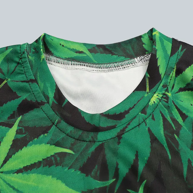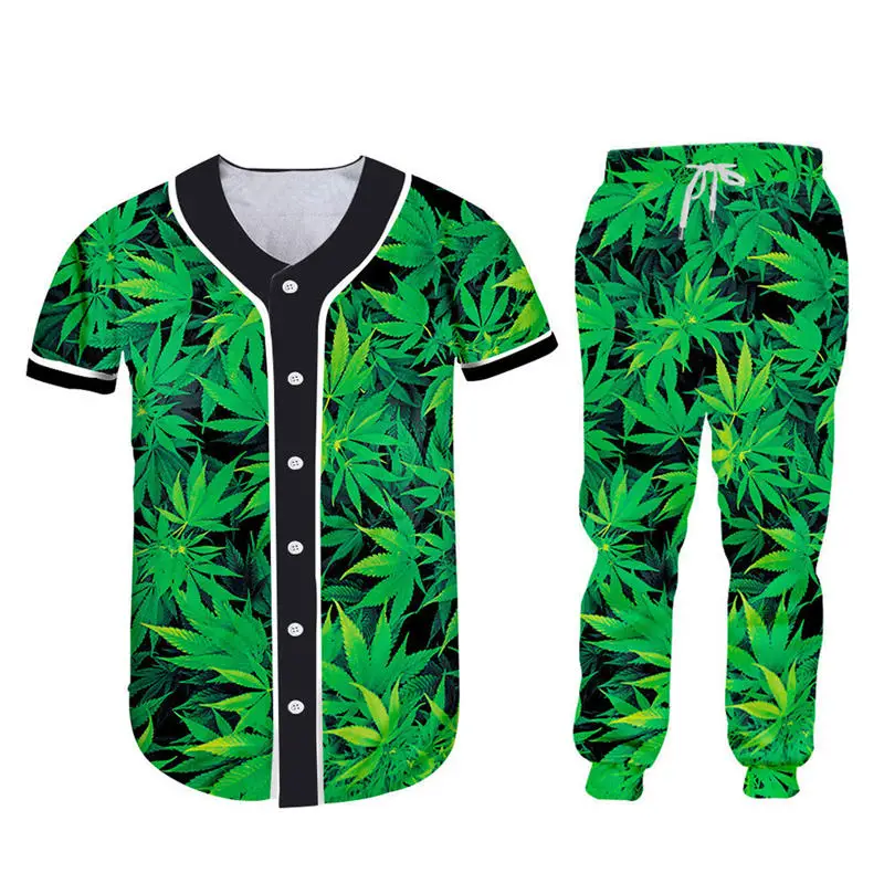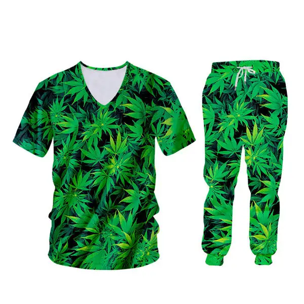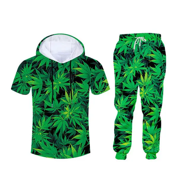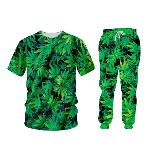 green hemp leaf print clothingmens tracksuit set,shirt pants set men