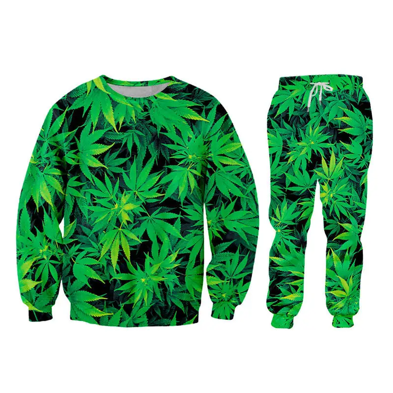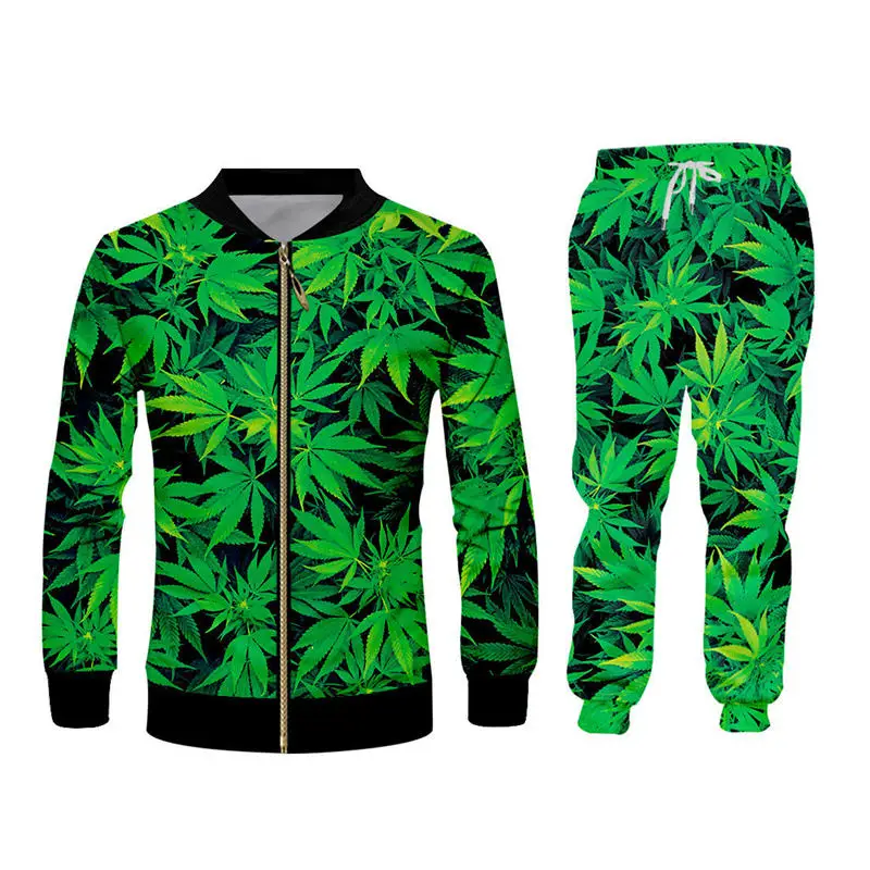 Мужской спортивный костюм большого размера, повседневный костюм унисекс из двух предметов, толстовка с капюшоном на молнии и штаны для бега, с 3d принтом зеленых сорняков, стиль Харадзюку