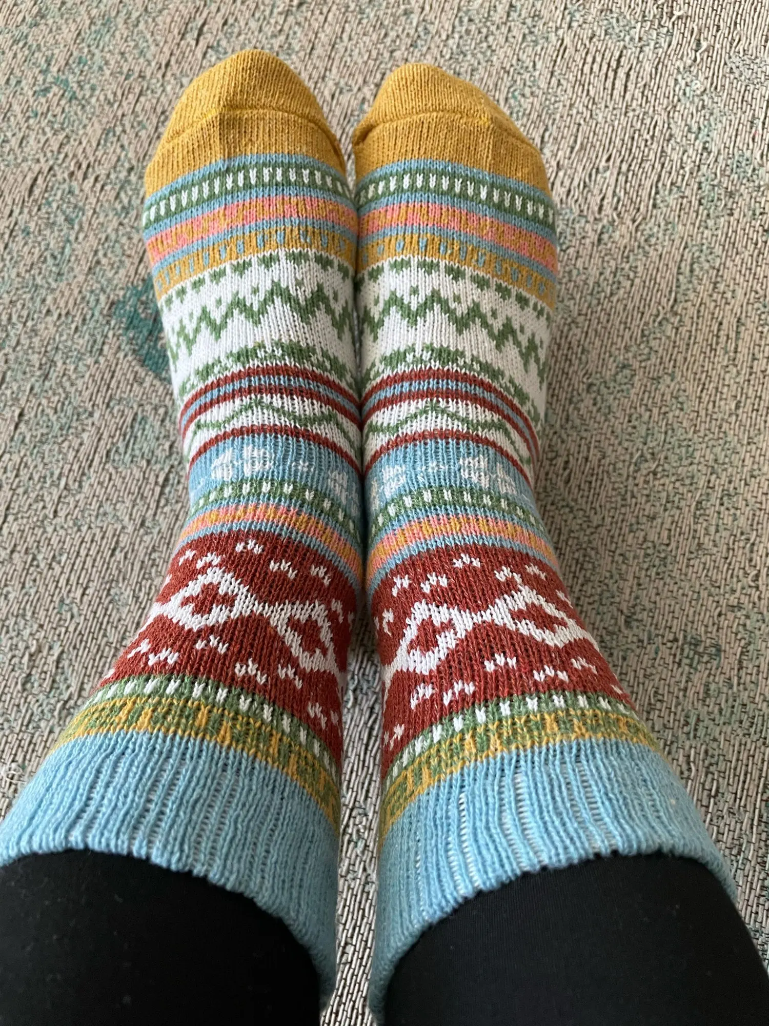 Хорошие женские носочки. На российский 35-й сели идеально. Тепленькие и нарядный. Советую.