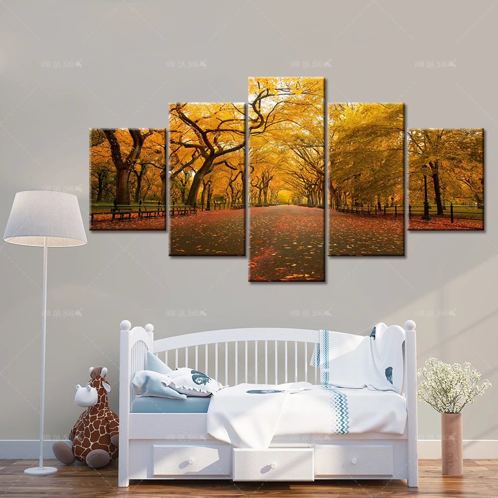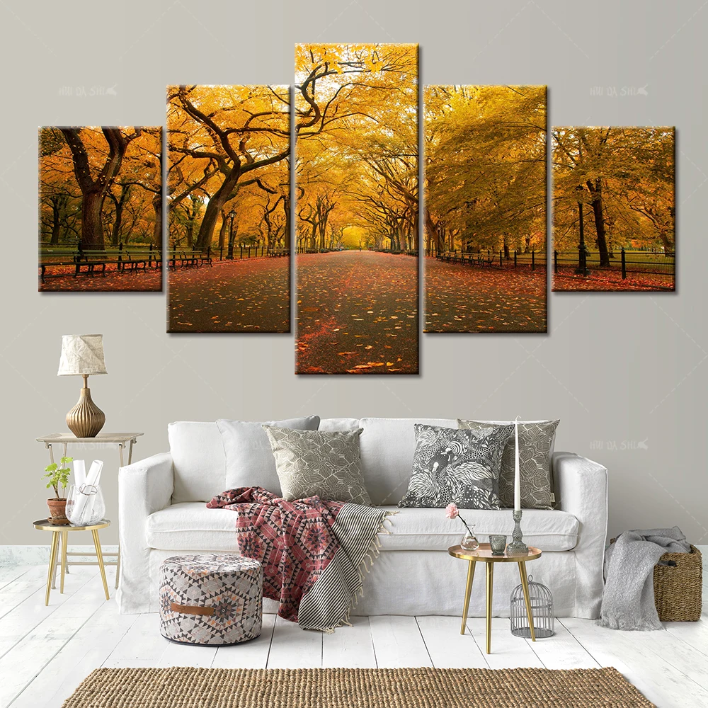 Модульный холст, HD печать, плакат, домашний декор, Настенная картина, 5 шт., лес, желтое дерево, художественный пейзаж, пейзаж, живопись, рама
