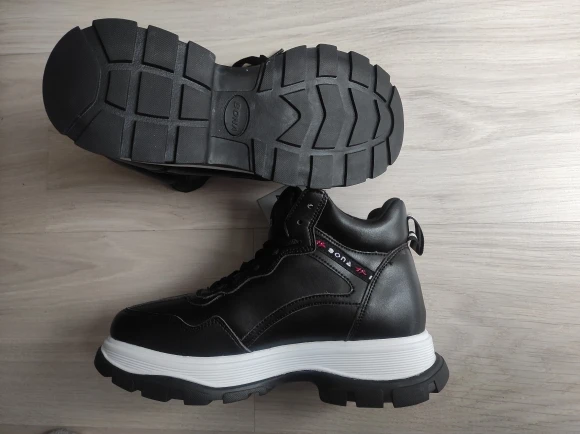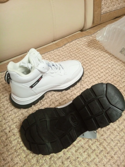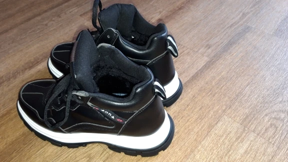 Отличные ботинки. Плотная бело-черная подошва, качественный кожзаменитель, внутри - искуственный мех.