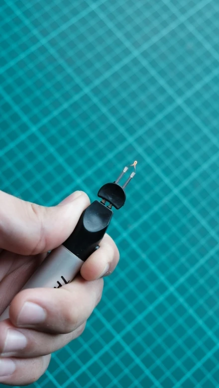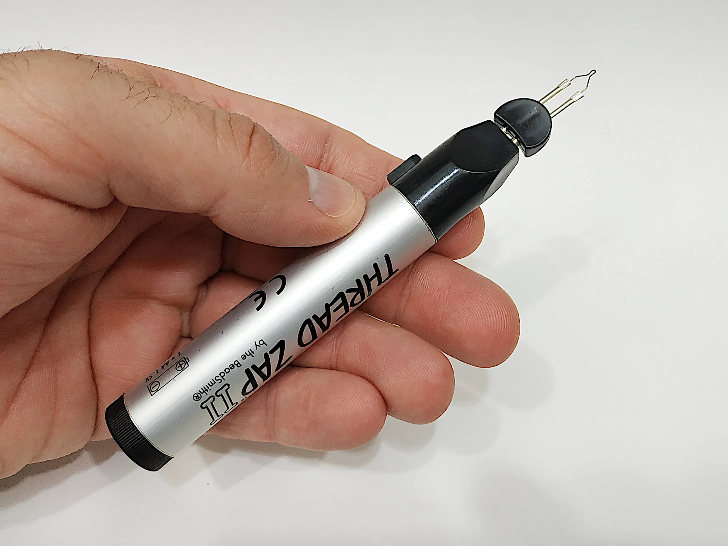У меня были некоторые проблемы с получением его для работы из-за плохого электрического контакта. Это очень простой механизм без электронных компонентов. Аккумулятор AA 1,5 В вставляется в алюминиевый корпус, и это положительный полюс соприкасается с более длинной ножкой наконечника внутри камеры. Отрицательный полюс батареи нажимается/подключается пружиной с металлическим кольцом, который контактирует с металлическим корпусом через маленькое металлическое лезвие. Маленькая кнопка рядом с наконечником закрывает контакт между корпусом и другой ногой наконечника внутри камеры. Таким образом, маленькая нить становится достаточно горячей, чтобы расплавить полимерную нить. Убедитесь, что положительный полюс батареи соприкасается с более длинной ножкой внутри камеры и затяните заднюю крышку, чтобы убедиться, что контакт закрыт. В общем, он маленький и хорошо работает, когда он правильно собран. Но он очень хрупкий.
