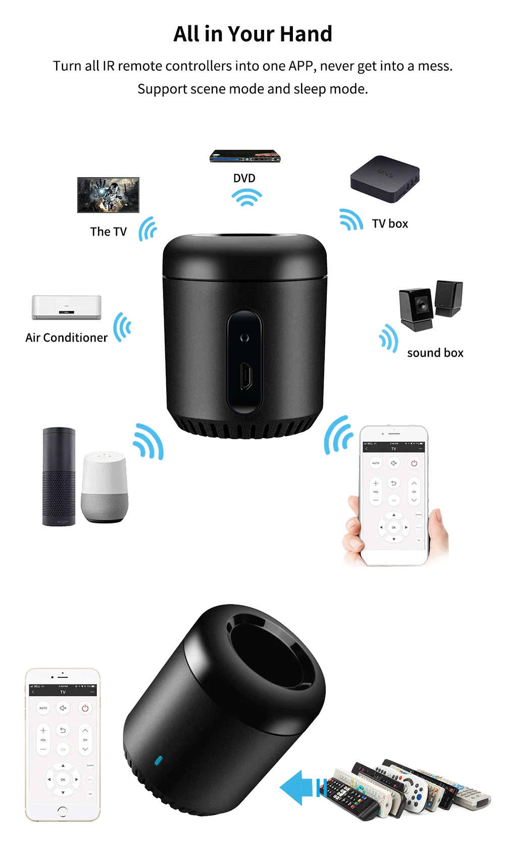 Support Infrared code libraryAir conditioning, TV, set top box, etc..