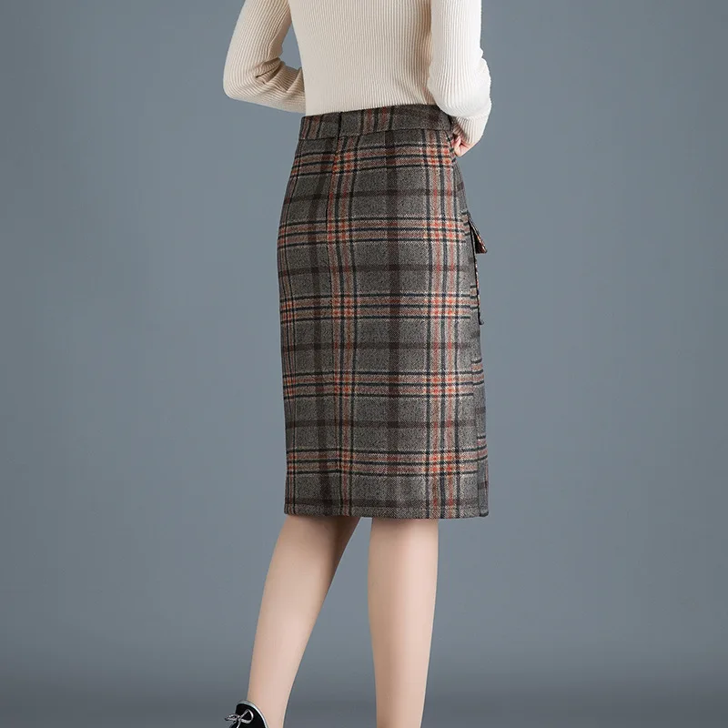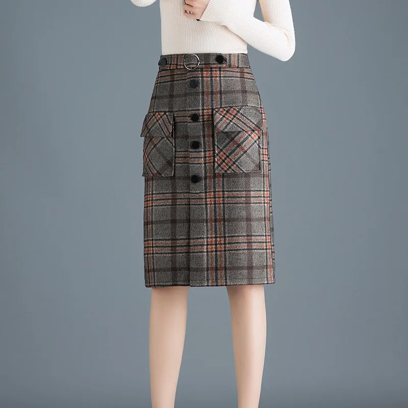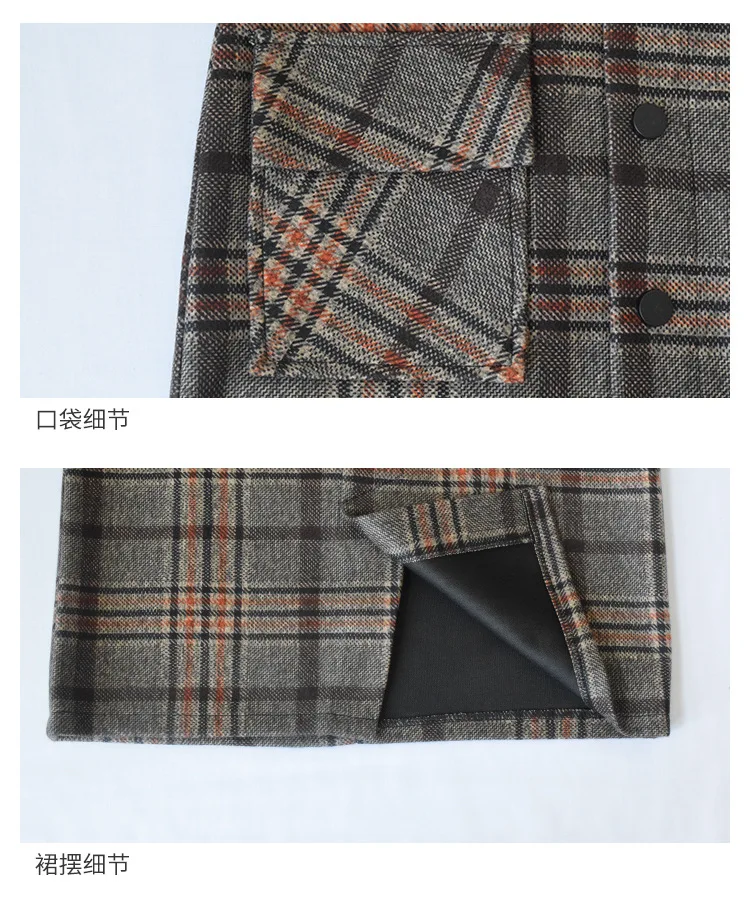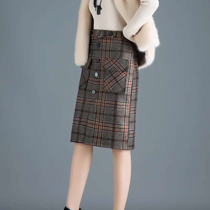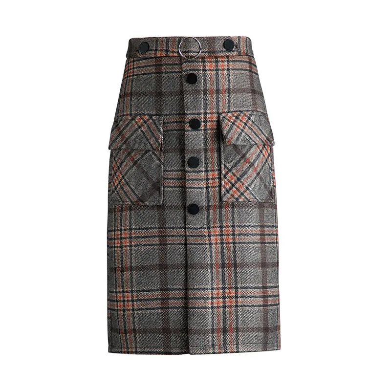 Женская шерстяная юбка с карманами, однобортная клетчатая юбка с высокой талией в Корейском стиле, весна 2022