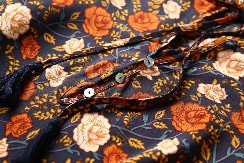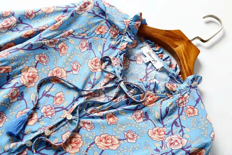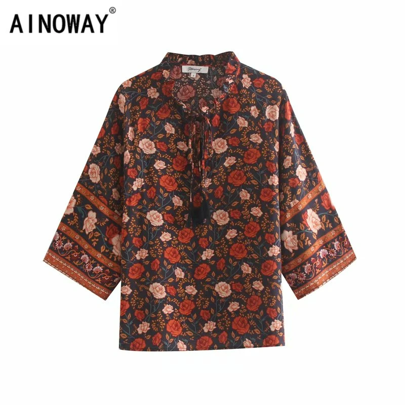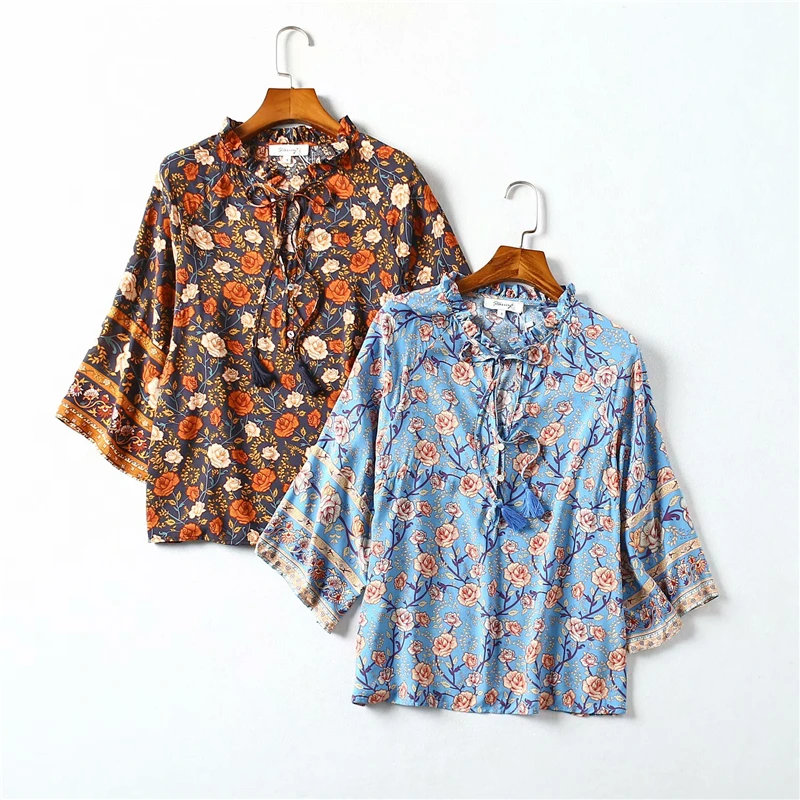 Винтажная шикарная Женская пляжная блузка из искусственного хлопка на шнурке с цветочным принтом, богемная рубашка, женские свободные рубашки в стиле бохо с расклешенными рукавами