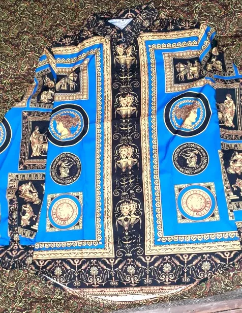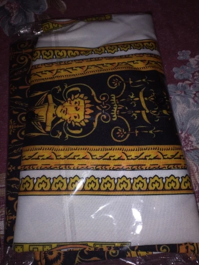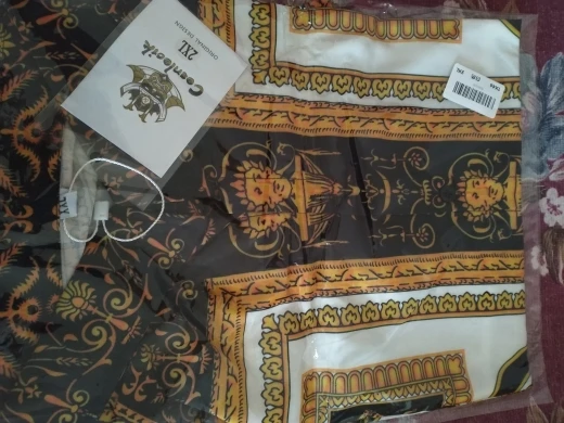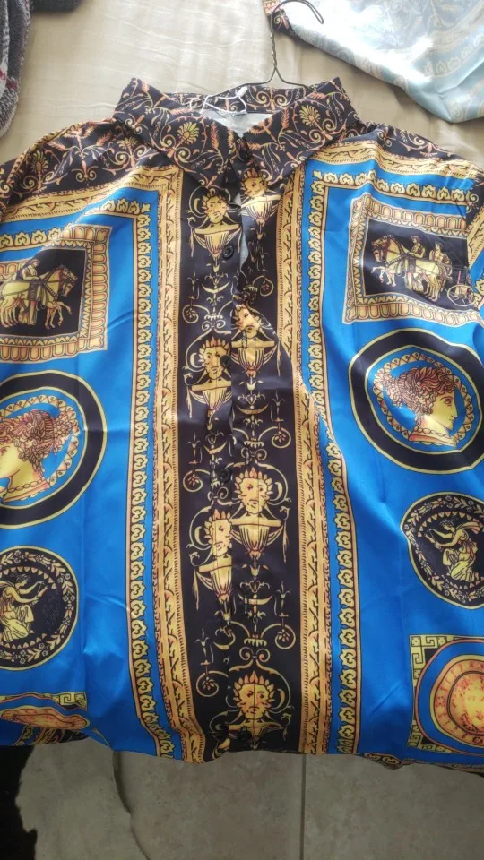 Прибыл в течение 3 недель. Хорошее качество. Пуговицы хорошо сшиты. Материал искусственный, но приятный на ощупь. Принт тоже выглядит нормально.