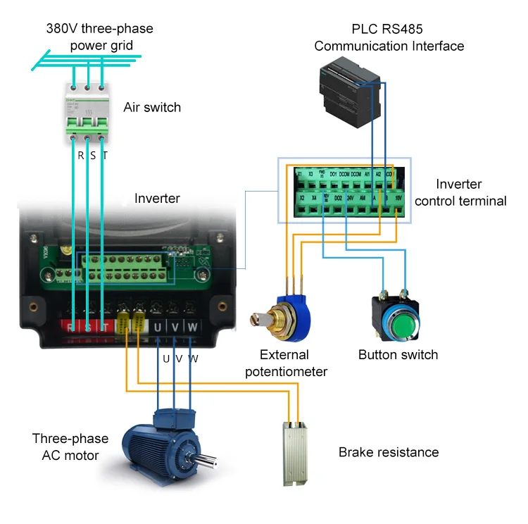 U, V, W-это выходные клеммы преобразователя частоты и подключенный трехфазный асинхронный двигатель. P и P B-это соединительные клеммы тормозного сопротивления.