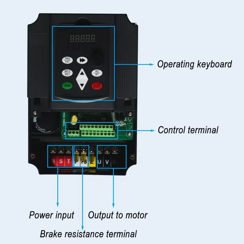 U, V, W являются выходными клеммами преобразователя частоты и подключен трехфазный асинхронный двигатель. P и P B являются соединительными клеммами тормозного сопротивления.