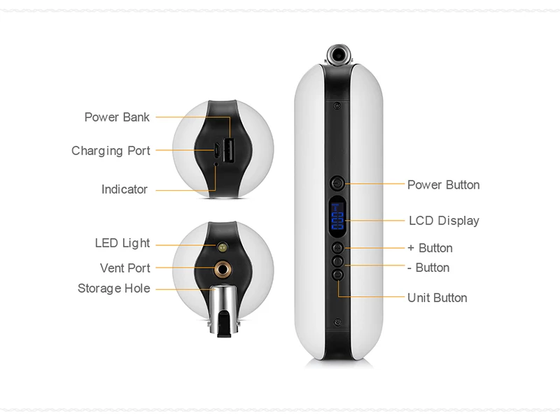 Характеристики:Материал: Поликарбонат и АБС-пластикЦвет: белый/черный на выборБатарея Емкость: 4*3,2 V/500mAh перезаряжаемый литий-БатареяРабочий ток: 1 ~ 5AВремя зарядки: 2,5 часовРежим зарядки: Micro USBМаксимальное давление: 150 фунтов на кв. дюйм/10 бар/90 кПа/10.5 кг/см2Рабочая температура: -10 °C ~ + 60 °C(14 °F ~ 140 °F)Размер: 18*5*5 см/7,08*1,97*1,97 дюймовПосылка Вес: 556g / 1.2lbОсобенности:● 150 фунтов на квадратный дюйм и точный контроль давления для быстрого надувания, удобный насос позволяет носить с собой и надувать ваши шины в чехол аварийной плоской шины на дороге.● Установите значение давления, и машина автоматически выключается, когда достигнет целевого значения.● Встроенный перезаряжаемый аккумулятор и около 2,5 часов полной зарядки.● Четкий ЖК-дисплей показывает текущее значение давления.● Может быть банком питания, когда ваш телефон не работает в аварийной ситуации.● Легко крепится на велосипеде с установочным аксессуаром или просто помещается в небольшую упаковку для вашего велосипеда, автомобиля, баскетбола, плавательного кольца и т. д.