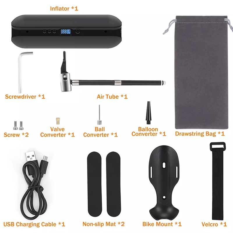 (1)* насос(1) * Воздушная трубка(1) * адаптер FV(1) * игла(1) * воздушный Кран(1) * USB кабель(1) * шестигранный ключ(1) * Нескользящие коврики(2) * Винт(1) * кронштейн для велосипеда(1) * крепежная лента(1) * сумка для переноски(1) * Руководство пользователя