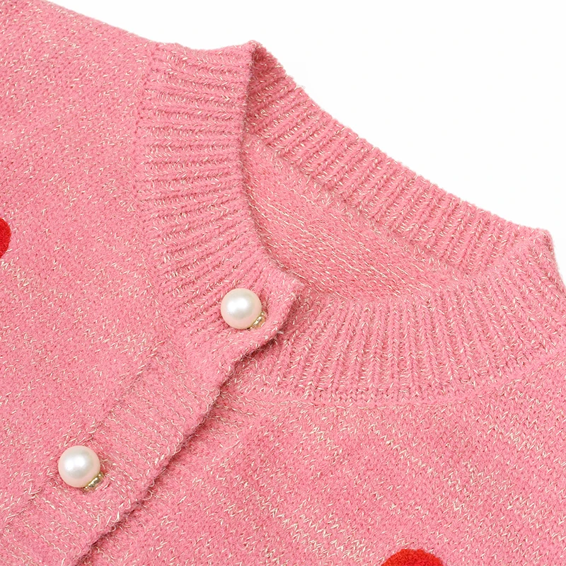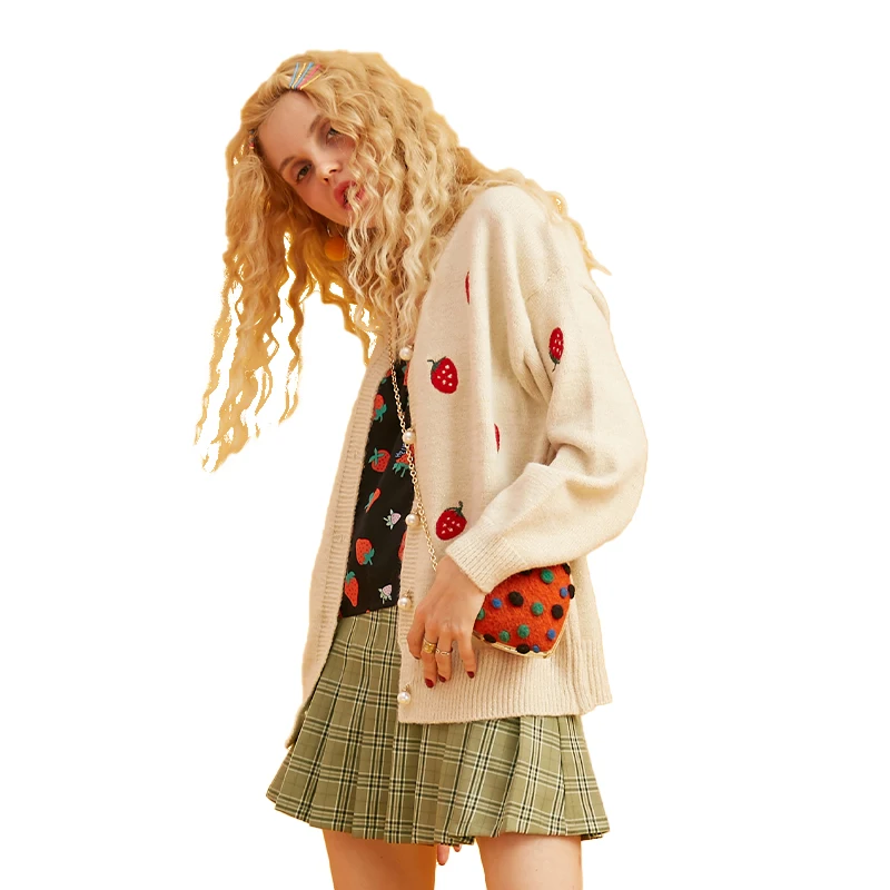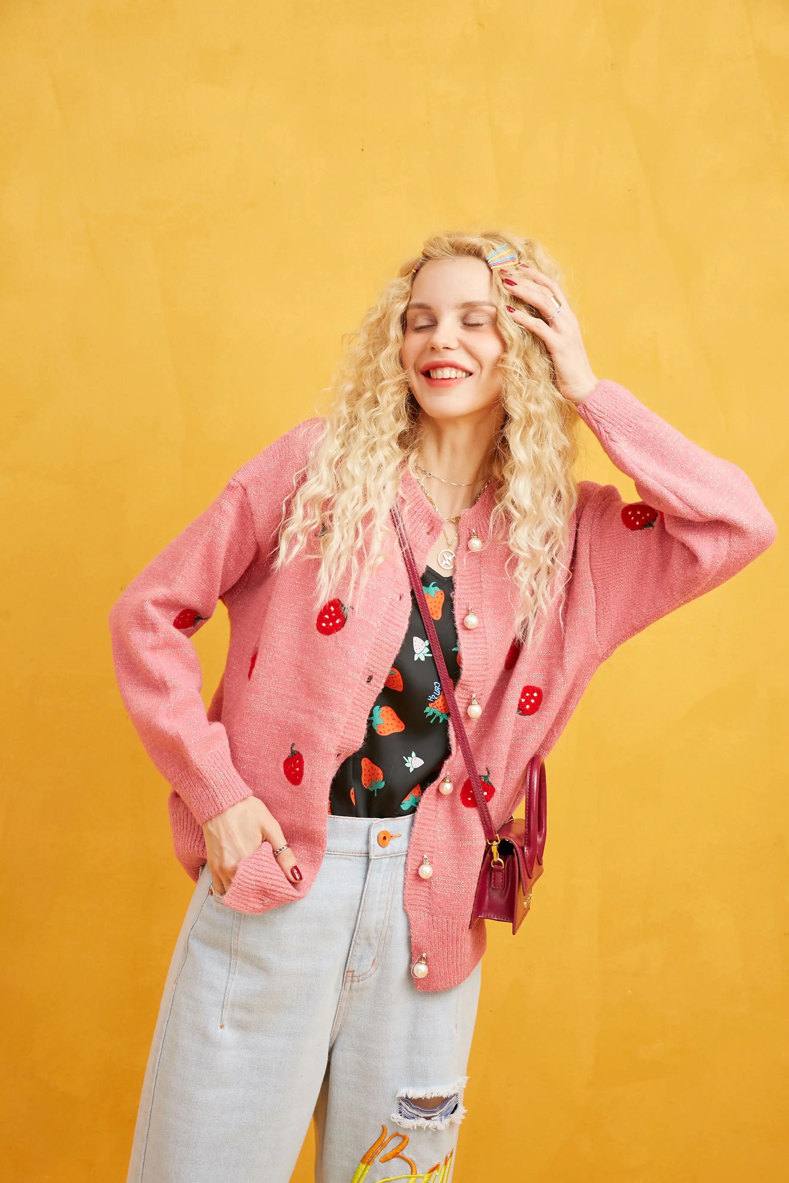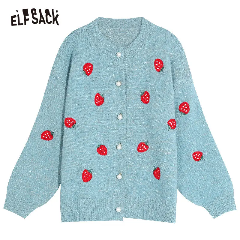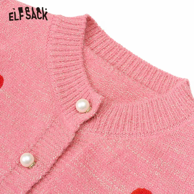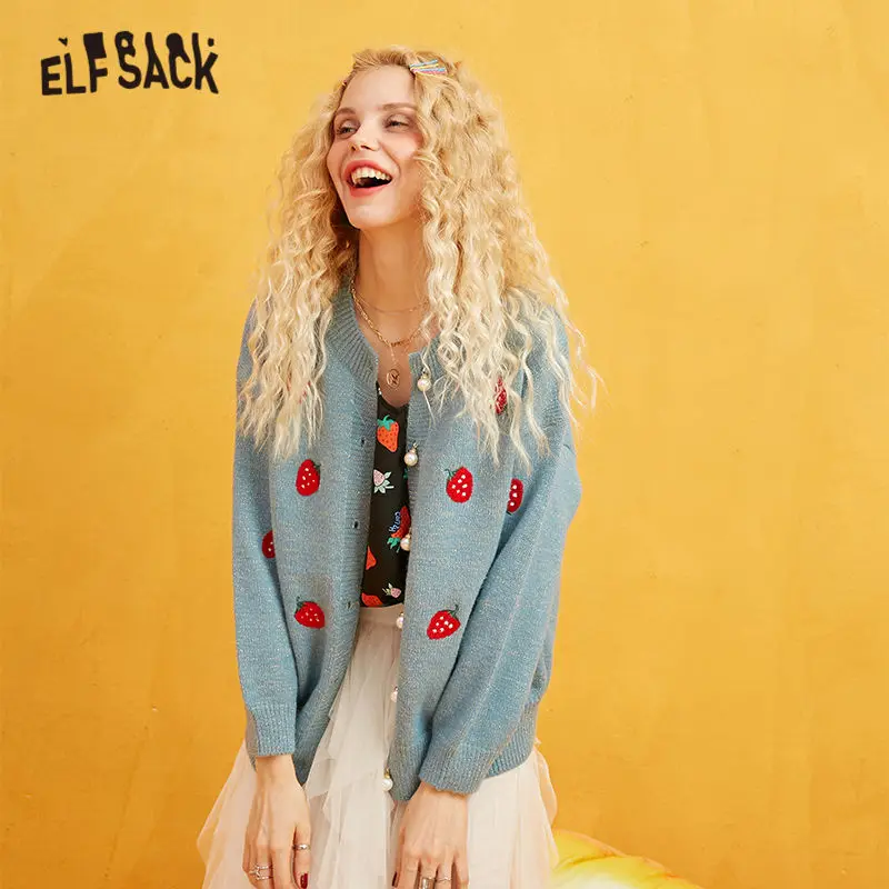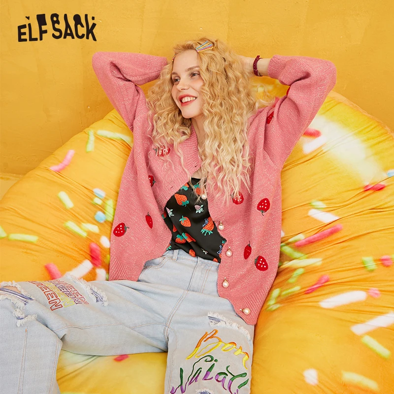 Женский кардиган ELFSACK, с вышивкой в виде клубники и жемчуга, на пуговицах, 2019, осень, с длинным рукавом, золотой шелк, корейский