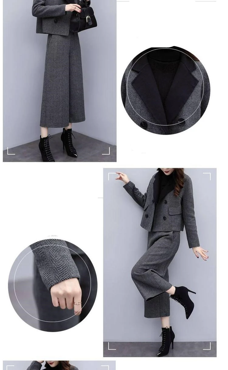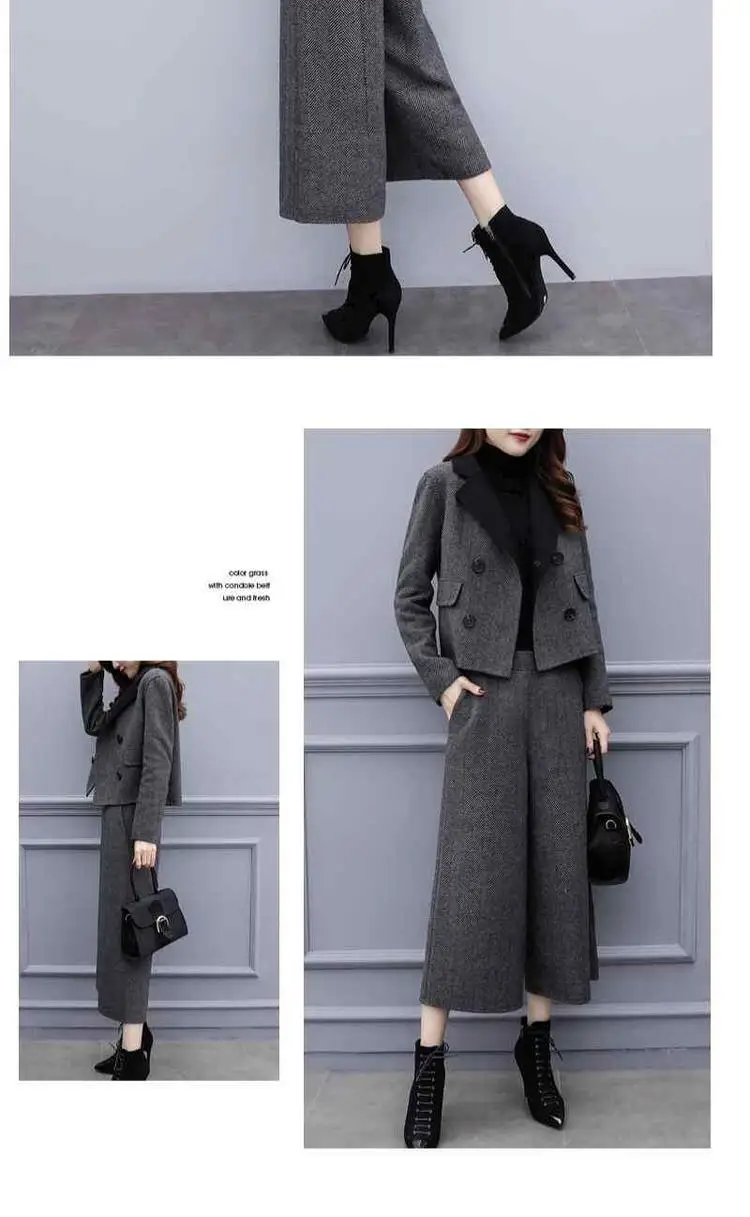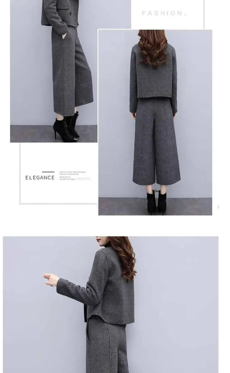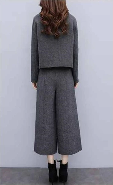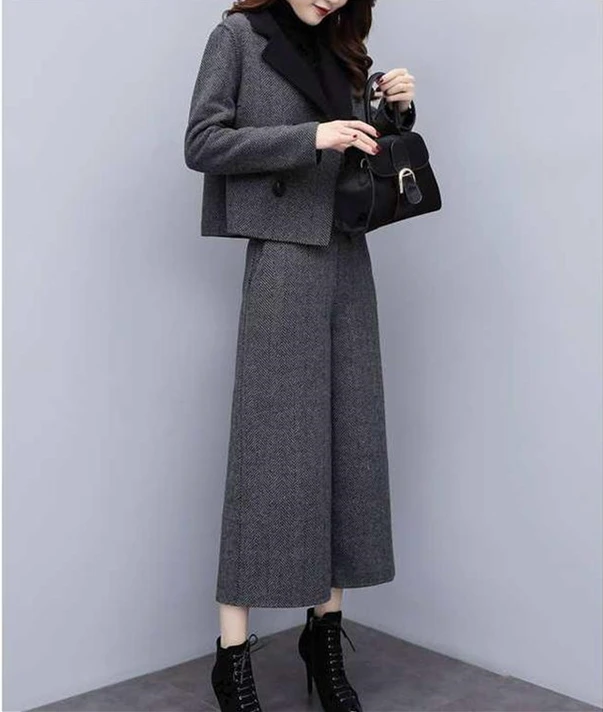 Осенне-зимний шерстяной комплект из двух предметов, женский короткий пиджак и брюки с широкими штанинами, элегантные офисные корейские комплекты, 2019