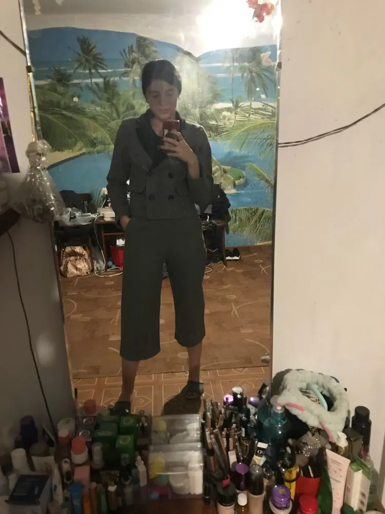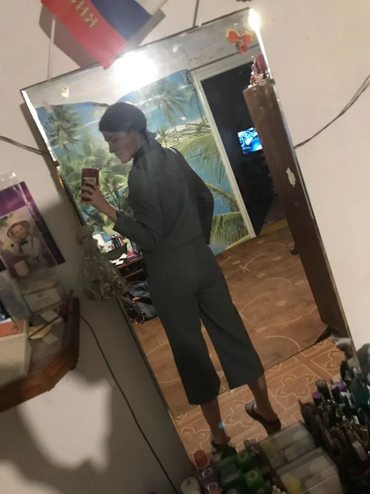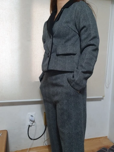 Очень довольна. Ткань совершенно не тонкая, теплая, не рыхлая, мягкая. Швы аккуратные. Отвороты пиджака - такая же ткань черного цвета. Брючки на ладонь- полторы ниже колена. Мои параметры - 104-75-92, рост 172. На попе брючки сели хорошо - попа большая, пиджак немного великоват - я верхней частью тела тощенькая. На брючках есть молния с правого бока, сзади - резинка.