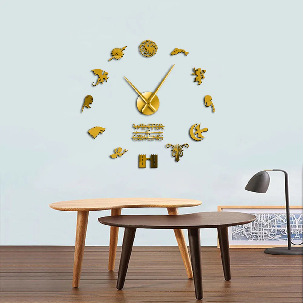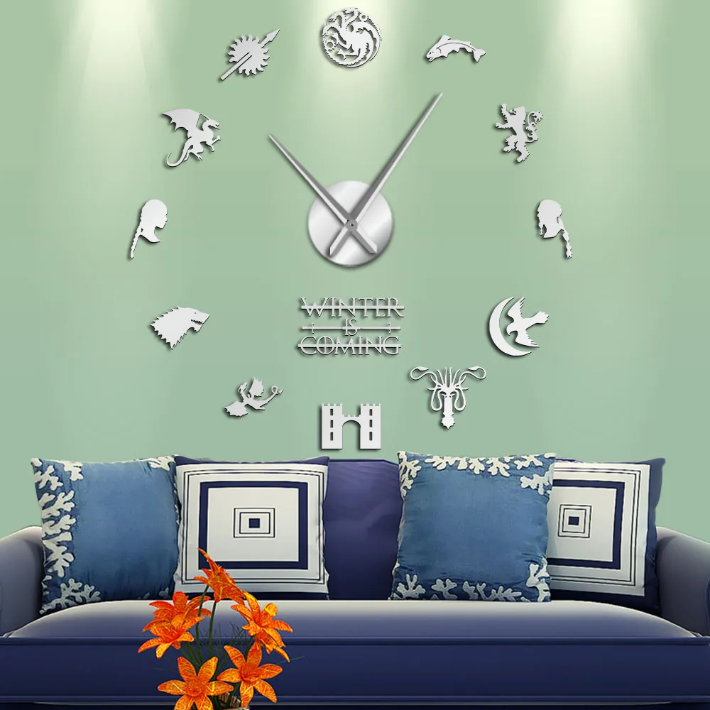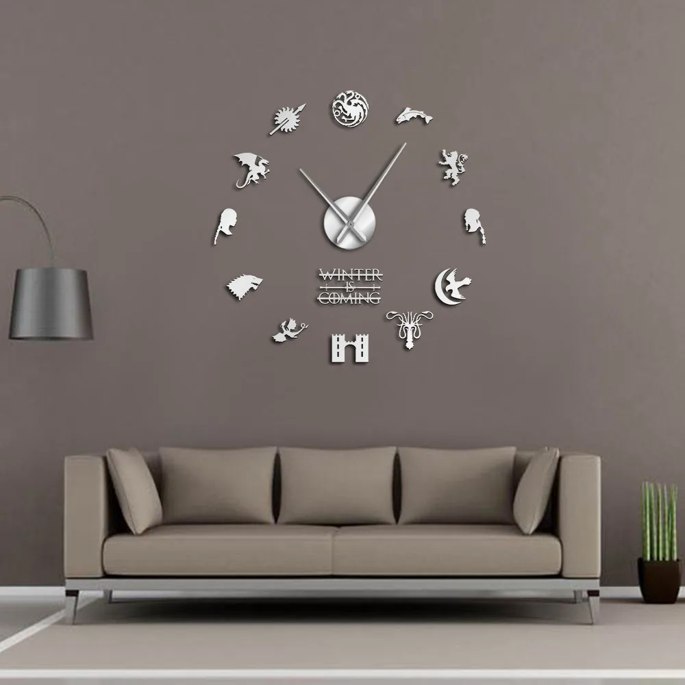 Настенные часы с зеркальными 3d-наклейками, большой бесшумный дом в средневековом стиле со словами СТАРКОВ, украшение для дома, большие иглы