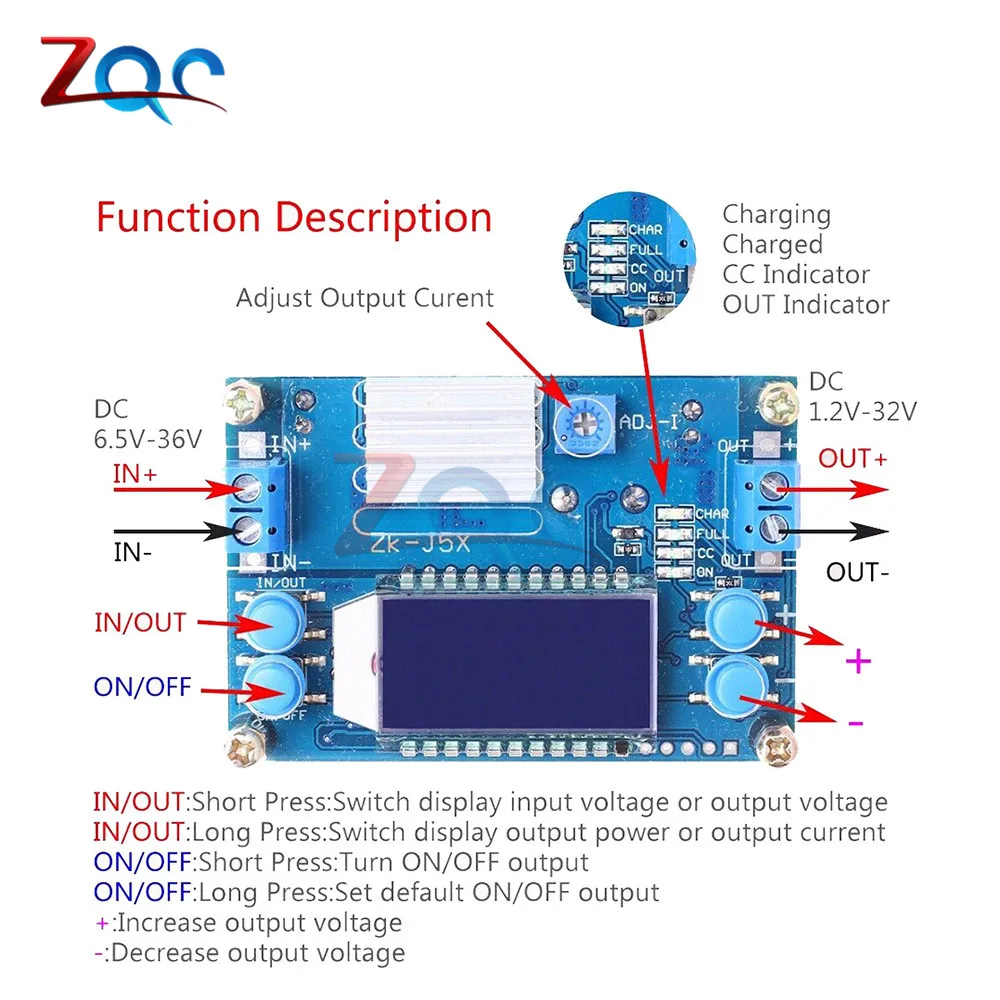 Описание: Этот товар является регулируемым постоянным напряжением постоянного тока, понижающим модуль питания с ЖК-дисплеем. HD дисплей Входное напряжение и выходное напряжение, ток, мощность и состояние дисплея. Регулируемое стабильное выходное напряжение и ток. Установите выходной ток для удовлетворения спроса. Его можно использовать как обычный модуль питания buck, зарядное устройство и светодиодный драйвер постоянного тока. Простой и эффективный, практичный. Особенности: Высокое напряжение стойкий терминал С высококачественной акриловой оболочкой Поддержка полный инвалидности выход Поддержка защиты от обратного хода Поддержка защита от короткого замыкания Поддержка включить выход ЖК-дисплей экран HD дисплей Поддержка функцией зарядного устройства Поддержка Выберите выход Поддержка дисплей Входное напряжение Поддержка отображения выходного напряжения, тока, мощности Поддержка работа индикатора состояния Несколько параметров отображаются одновременно Высокий ток, низкое тепло Параметры: Рабочая Напряжение: DC 6,5 V-36V Выходное напряжение: DC 1,2 V-32V постоянного тока Выходной ток: 5А (4,5а нужен радиатор; 3,5а стабильный в течение длительного времени) Выходная мощность: 75 Вт (75 Вт нужен радиатор; 50 Вт для 3,5a) Напряжение Дисплей диапазон: 1,2 ~ 32В Точность отображения напряжения: +/-0,1 в Напряжение Дисплей Разрешение: 0,05 V Диапазон отображения тока: 0 ~ 5A Точность отображения тока: +/-0.05A Разрешение дисплея напряжения: 0.005A Эффективность преобразования: около 94% Рабочий ток: 30mA Мягкий стартер: Да (отказ при высокой нагрузке) Защита от обратного хода: Да Защита от обратного потока: нет (рекомендуется подключить диод в серии «Out +») Диапазон рабочих температур:-20 ℃ ~ 85 ℃ Диапазон рабочей влажности: 0%-95% RH Размер без корпуса: 68*47*26 мм Размер с оболочкой: 70,5*48,4*30 мм Размер радиатора: 20*14*6 мм Кнопка/потенциометр/светодиодный Введение: Длительное нажатие означает, что необходимо удерживать нажатие более 3 секунд. ВКЛ/ВЫКЛ: короткое нажатие, чтобы выбрать выходное напряжение. Длительное нажатие используется для восстановления настроек по умолчанию для следующей перезарядки. Вход/выход: короткое нажатие для переключения отображения входного напряжения или выходного напряжения. Длительное нажатие используется для переключения выходного тока или выходной мощности. Кнопка '+': используется для регулирования выходного напряжения. Увеличить выходное напряжение. При каждом нажатии кнопки для короткого нажатия, выходное напряжение увеличивается на 0,05 V. Нажмите и удерживайте кнопку может непрерывно. Увеличение 0,1 V, 1V в режиме непрерывного в том случае, если держать нажмите и удерживайте кнопку снова. Кнопка ' - ': используется для регулирования выходного напряжения. Уменьшение выходного напряжения. При каждом нажатии кнопки для короткого нажатия, выходное напряжение уменьшается на 0,05 V. Нажмите и удерживайте кнопку может постоянно уменьшаться. Уменьшение 0,1 V, 1V в режиме непрерывного в том случае, если держать нажмите и удерживайте кнопку снова. ADJ-I потенциометра: Регулировка выходного тока. Увеличьте выходной ток при вращении по часовой стрелке. Модуль входит в выходное состояние постоянного тока, если ток нагрузки достигает установленного значения тока. Красный светодиодный индикатор постоянного тока включится. Светодиодный: зеленый светодио