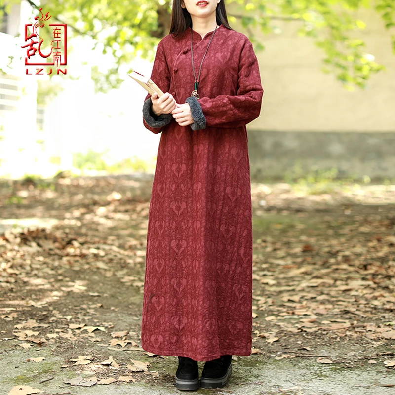 LZJN китайское платье для женщин осень зима длинный рукав Cheongsam Qipao жаккард флисовая подкладка теплое плотное платье халат Vestidos
