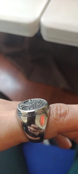 Кольцо из сплава, но с большим содержанием стали - реагирует на магнит, вес 17,6 гр, немного пустотелое, сверху покрытие. Качество неплохое, сделано аккуратно, тяжелое. Размерная линейка не совпадает, можно смело отнимать 1,5-2 размера. Еле угадала , 7 это на 17-17,5. Из трех вариантов колец дерева жизни заказанных мной это лучшее. Четверка за то что это не 100% высококачественная сталь.