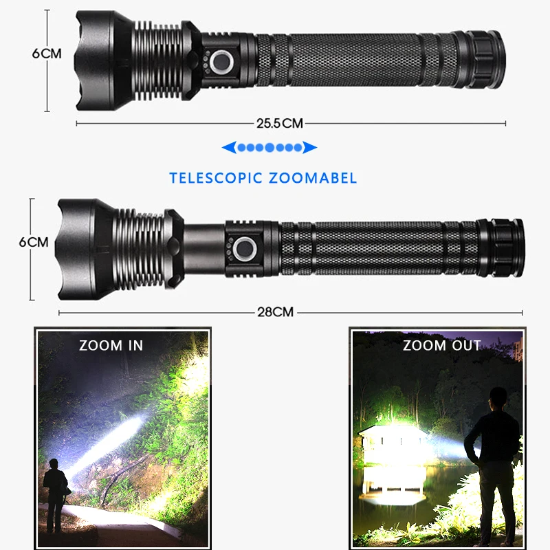 Мощный светодиодный фонарик использует XLamp XHP70.2 led с максимальной выходной мощностью до 50000 люмен Увеличьте 2*18650 или 2*26650 отсека для перезаряжаемых батарей, чтобы увеличить время работы. Дисплей емкости батареи, телескопический зум Микро-usb для компьютера USB, автомобильный USB, USB-разъем для зарядки, зарядный фонарик Изготовлен из надежного алюминиевого сплава класса aero HAIII, армейского класса, твердый анодированный Водонепроницаемость соответствует IPX-6, водонепроницаемость, можно использовать в дождливую погоду, но нельзя класть в воду Подходит для работы, охоты, альпинизма, рыбалки, кемпинга и активного отдыха и т. д. Ударопрочность до 2 метров