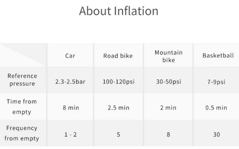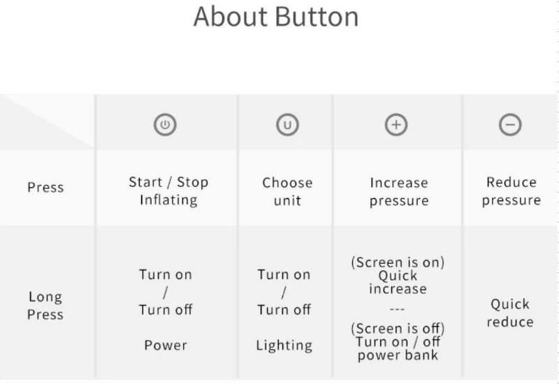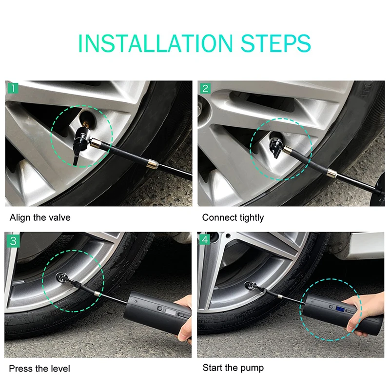 1. Подключите один конец воздушной трубки к инфлятору, подключите другой конец к клапану шины. (Для французского клапана Сначала установите преобразователь клапана.2. Нажмите кнопку питания, чтобы включить питание. ЖК-дисплей будет отображать текущее давление.3. Нажатие кнопки «блок» может переключить единицы измерения (PSI \ BAR \ KPA \ kgf/cm2). (Рекомендуемый диапазон давления можно найти на шине в целом.)4. Кнопка + и кнопка являются предварительно настроенными кнопками для регулировки целевого давления. Длительное нажатие позволяет быстро регулировать давление. (Если пропустить шаг 4, целевое давление-это значение, которое вы предварительно указали в прошлый раз.)5. Нажатие кнопки питания может начать надувать. Повторное нажатие может сделать паузу/продолжить. Он остановится автоматически, когда достигнет целевого давления.6. Когда Воздушная трубка отделена от клапана шины, пожалуйста, быстро извлеките воздушную трубку из шины, чтобы предотвратить утечку воздуха.7. Инфлятор не будет работать, когда установленное вами целевое давление будет ниже, чем текущее давление в шинах.
