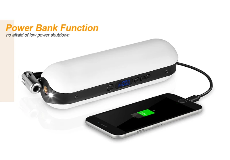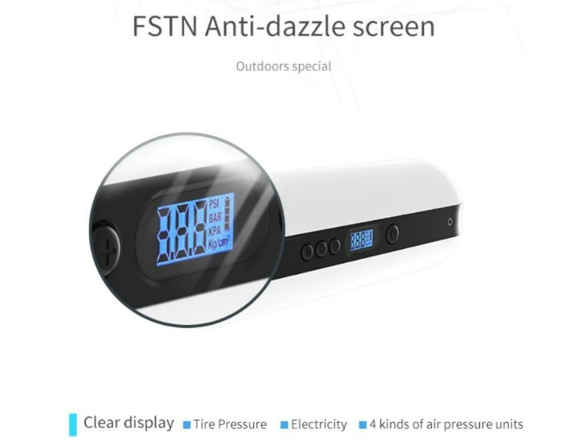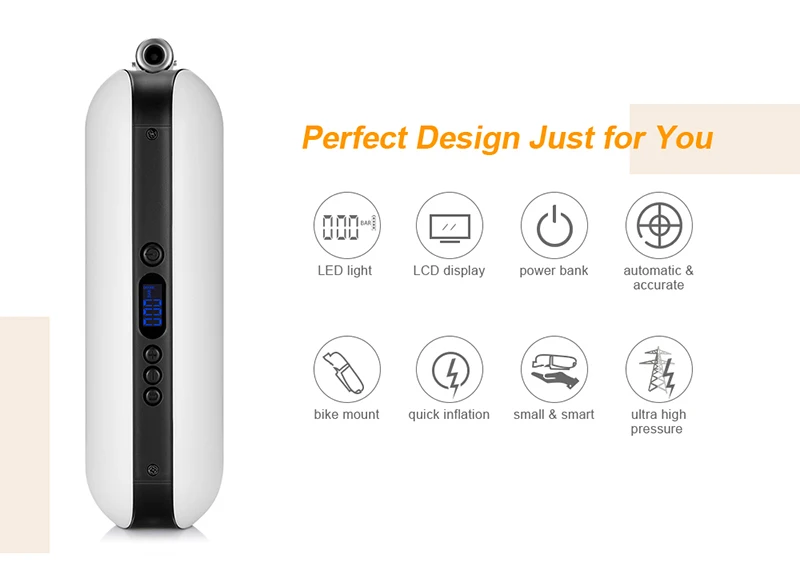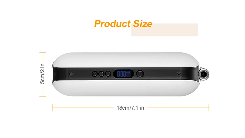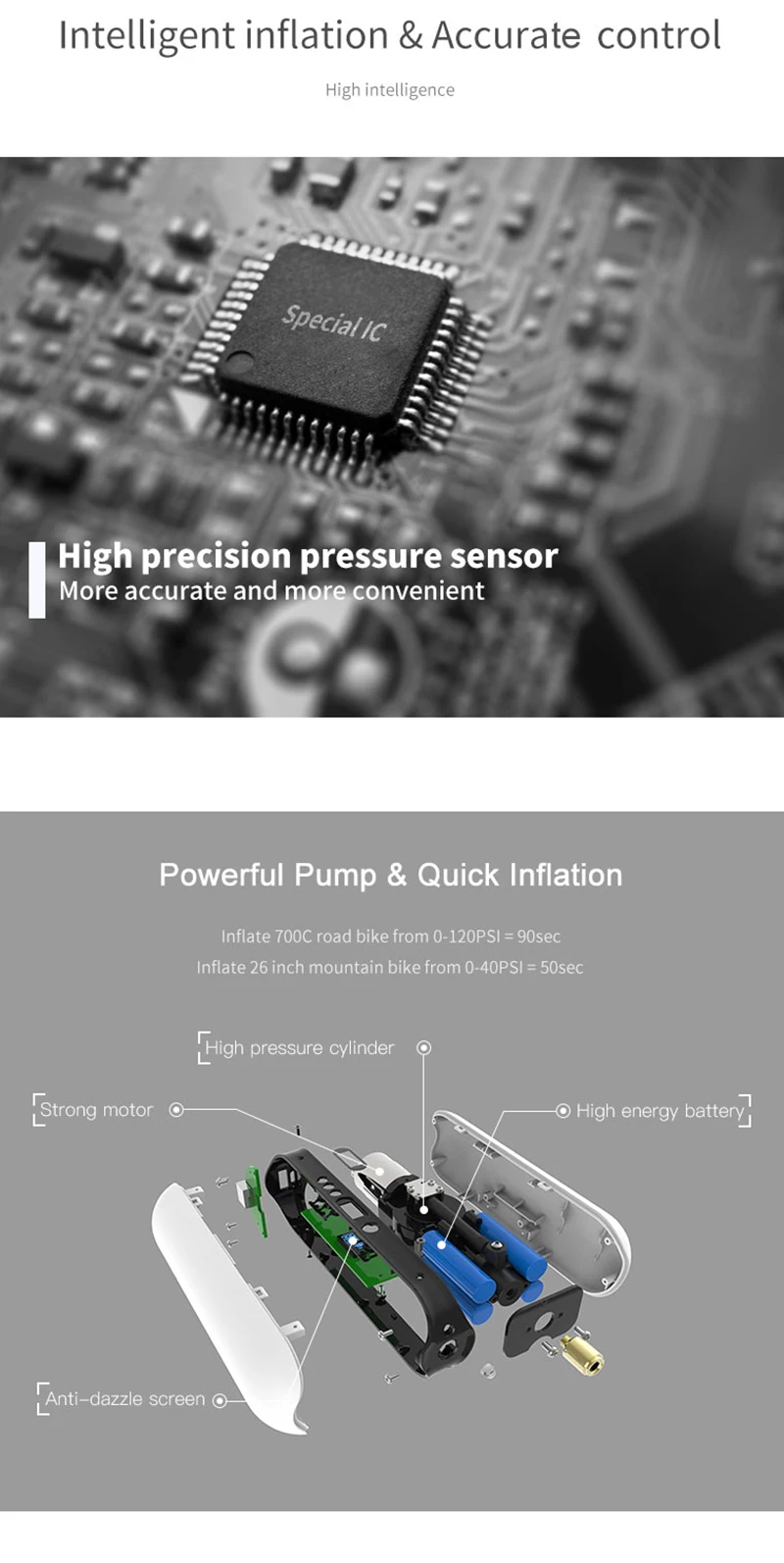 Характеристики:Материал: Поликарбонат и АБС-пластикЦвет: белый/черный на выборБатарея Емкость: 4*3,2 V/500mAh перезаряжаемый литий-БатареяРабочий ток: 1 ~ 5AВремя зарядки: 2,5 часовРежим зарядки: Micro USBМаксимальное давление: 150 фунтов на кв. дюйм/10 бар/90 кПа/10.5 кг/см2Рабочая температура: -10 °C ~ + 60 °C(14 °F ~ 140 °F)Размер: 18*5*5 см/7,08*1,97*1,97 дюймовПосылка Вес: 556g / 1.2lbОсобенности:● 150 фунтов на квадратный дюйм и точный контроль давления для быстрого надувания, удобный насос позволяет носить с собой и надувать ваши шины в чехол аварийной плоской шины на дороге.● Установите значение давления, и машина автоматически выключается, когда достигнет целевого значения.● Встроенный перезаряжаемый аккумулятор и около 2,5 часов полной зарядки.● Четкий ЖК-дисплей показывает текущее значение давления.● Может быть банком питания, когда ваш телефон не работает в аварийной ситуации.● Легко крепится на велосипеде с установочным аксессуаром или просто помещается в небольшую упаковку для вашего велосипеда, автомобиля, баскетбола, плавательного кольца и т. д.