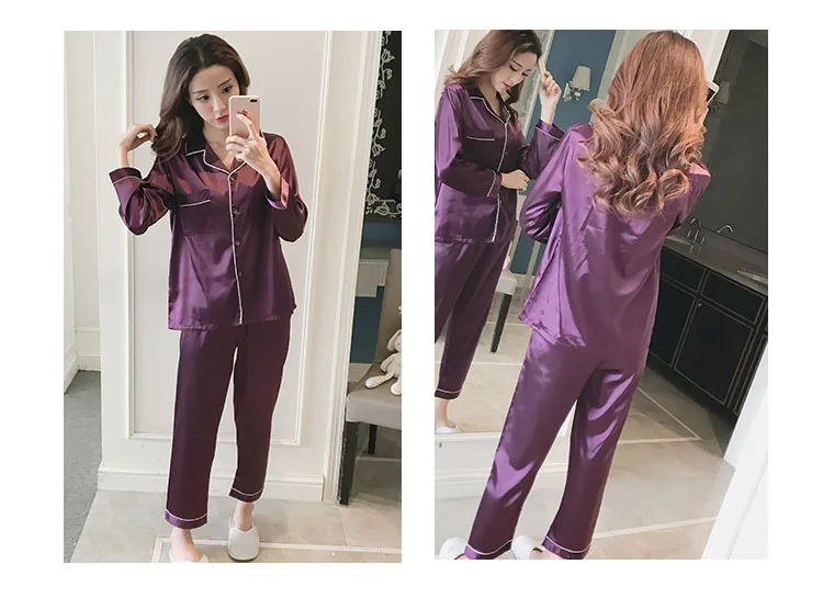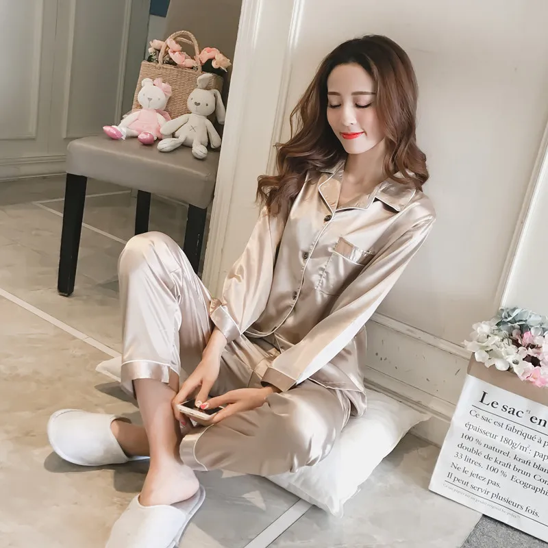 Женская атласная пижама, комплект для сна с длинным рукавом и длинными пуговицами, домашняя одежда, M-5XL