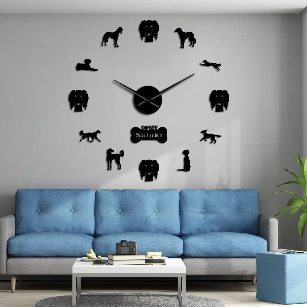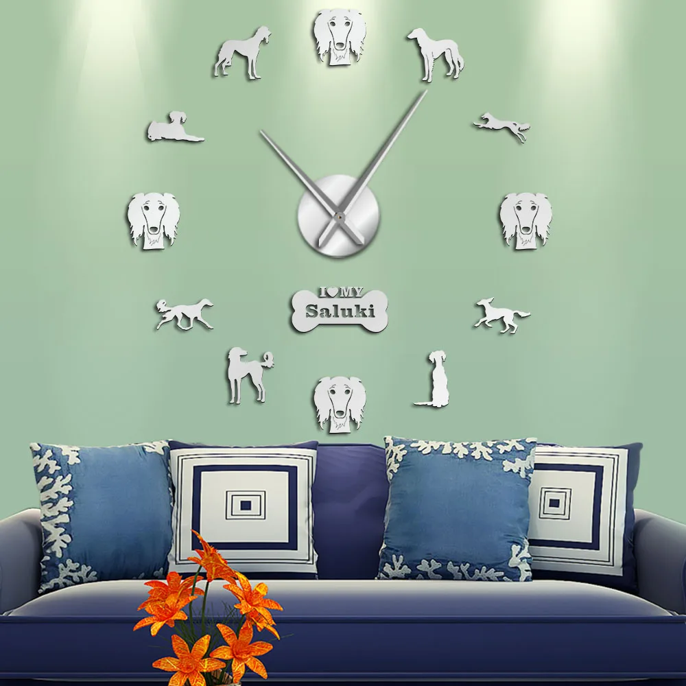 Whippet собака породы Салуки DIY гигантские настенные часы настенные художественные наклейки с зеркальным эффектом Висячие часы домашний декор Салуки владельцы подарок