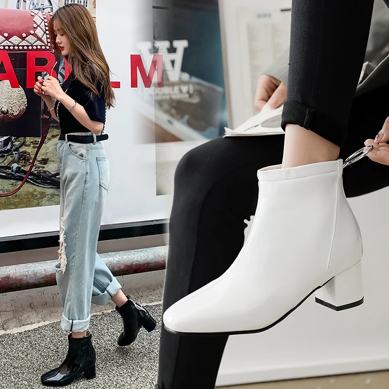 Женские ботильоны из лакированной кожи, ботинки на высоком устойчивом каблуке, на молнии, с круглым носком, белые, красные, черные, Осень-зима 2020