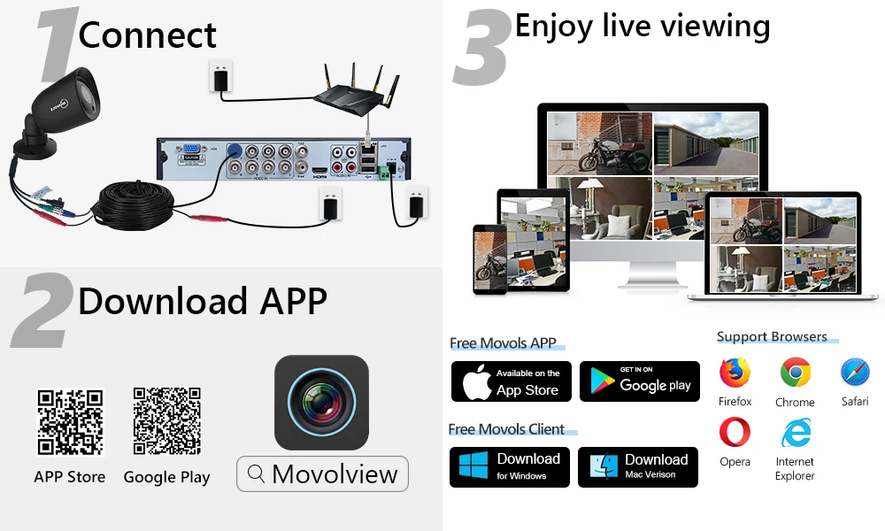 Независимо от того, где вы находитесь, вы можете удаленно получить доступ к камере безопасности, чтобы увидеть Потоковую передачу в реальном времени и оставаться на связи. Удаленно просматривайте камеры с помощью бесплатного приложения Movols на вашем мобильном устройстве, бесплатного клиента Movols на вашем компьютере, веб-браузере (например, Google Chrome, Microsoft Edge, Safari, Firefox и т. д.).