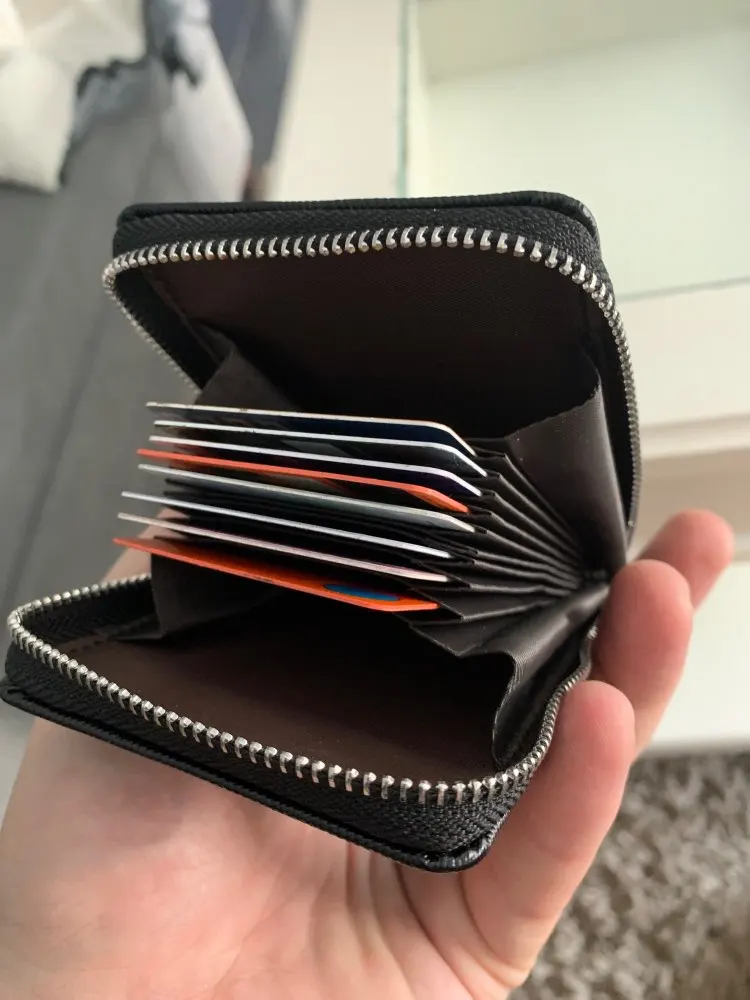 Хорошее соотношение цены и качества, соответствует описанию. Застежка-молния отлично работает и вмещает множество кредитных карт, единственным недостатком является то, что вы не можете положить много монет или это стоит его закрыть.