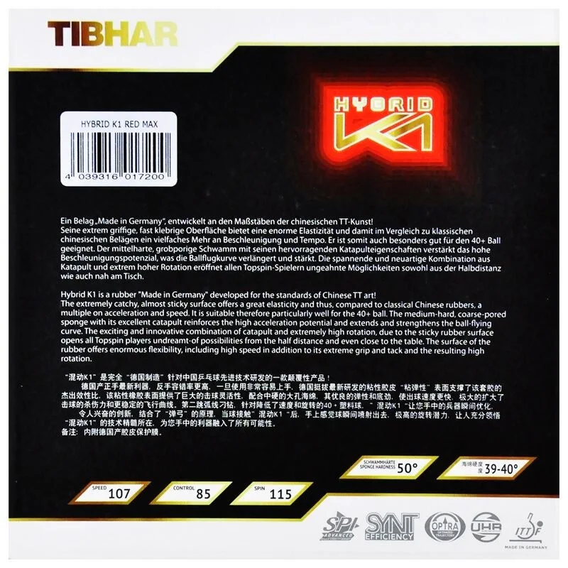 - The goal of research was the consistent further development of the HYBRID K1 rubber and to create an innovative and thrilling product! The excellent feedback of HYBRID K1 in the market has led us to create the next version of HYBRID K1-the HYBRID K1 PLUS! In the HYBRID rubber we have managed to combine the elasticity and tension which means high catapult effect and stickiness to create tremendous spin. The -in comparison to the K1-harder sponge allows to hit the ball with high strength, The large-pored sponge keeps the ball trajectory high and stable and is responsible to create faster balls without losing the control over it, The elasticity and tension of the rubber surface on one hand and the stickiness of the surface combined with the leading technology of TIBHAR sponge is the secret of this rubber. HYBRID K1 PLUS can easily obtain more stable flight curves in both offensive and defensive play. The ball arc is tricky, longer and not foreseeable for your opponent. Especially developed for the 40+ balls.