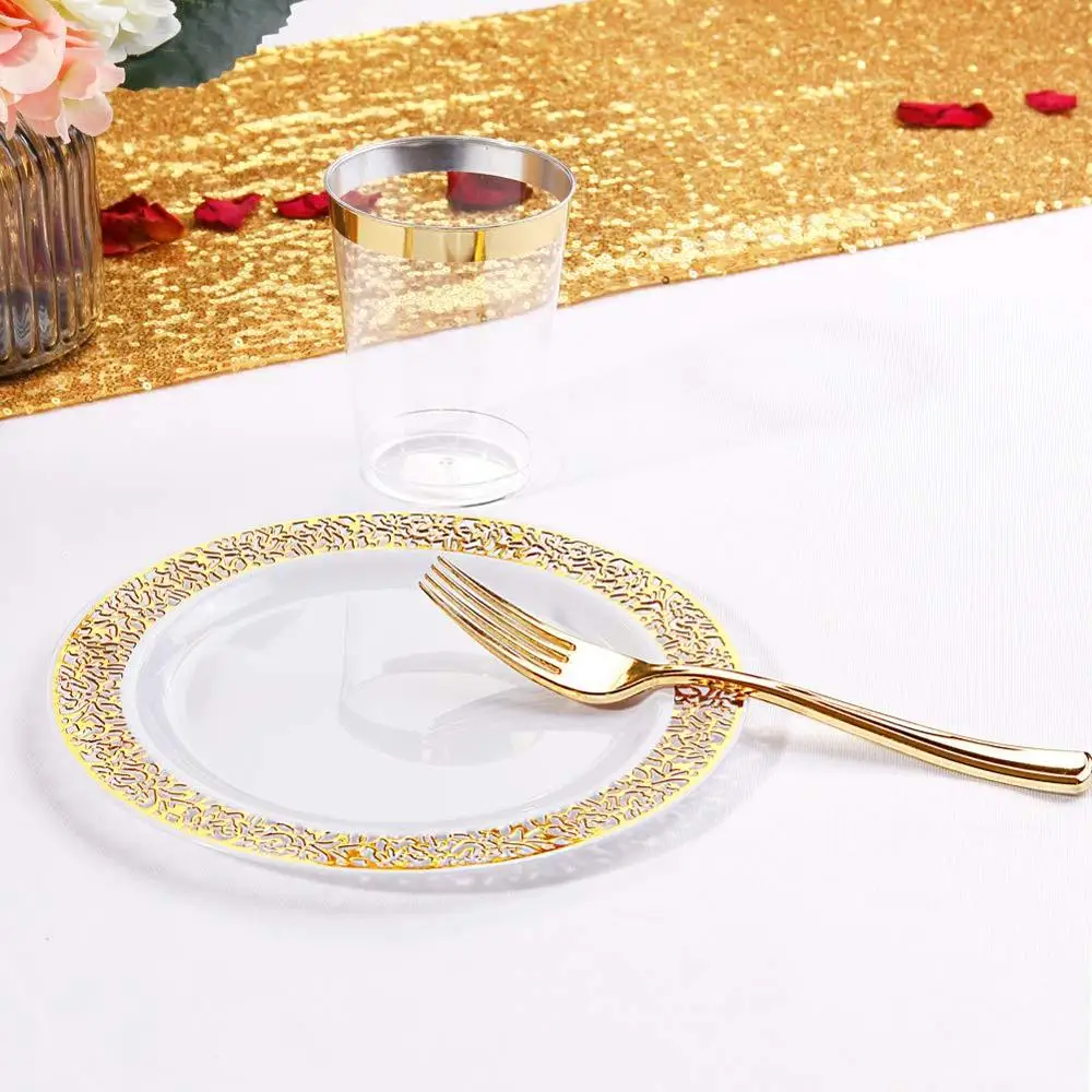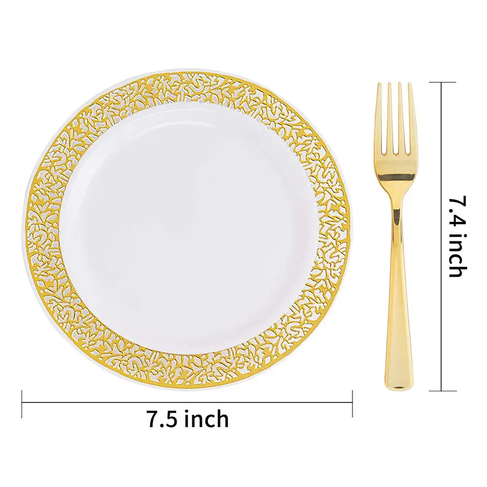 25 золотых десертных тарелок 7,5 дюйма с 25 одноразовыми вилочками 7,4 дюйма, пластиковые тарелки с кружевным дизайном для свадебной вечеринки, красивая тарелка для салата