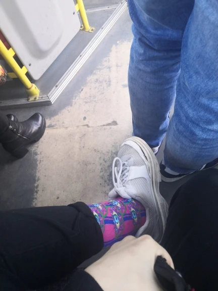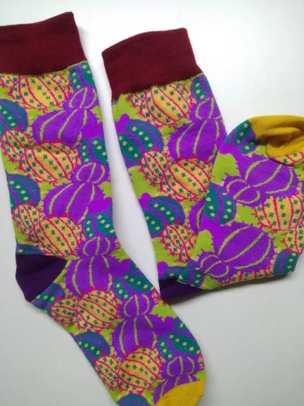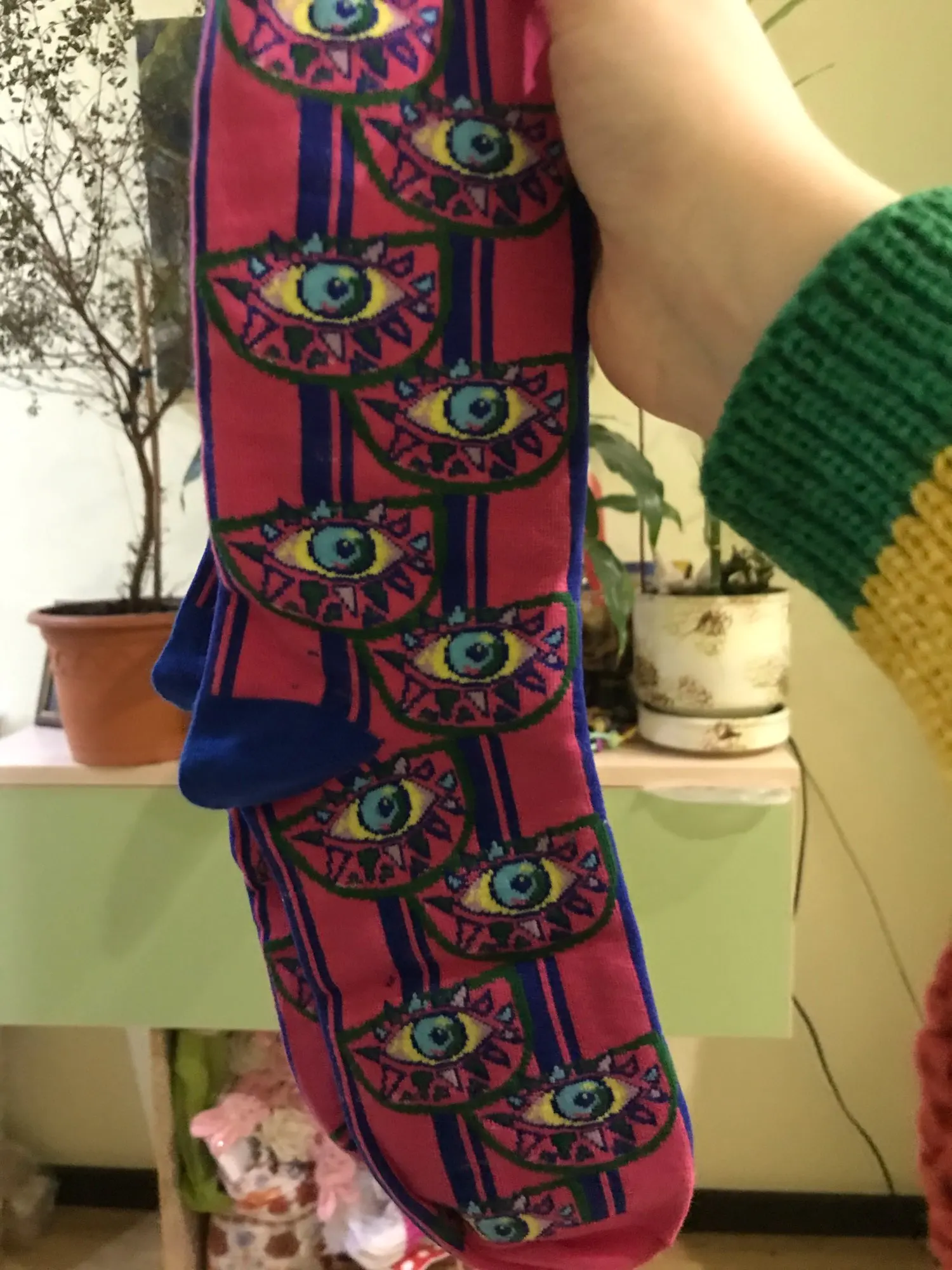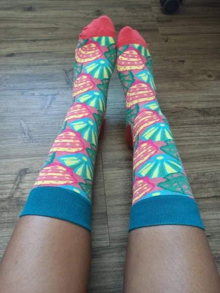 Красивые яркие носки,но на худую ногу. У меня щиколотки тонкие,и то не очень удобно снимать и надевать