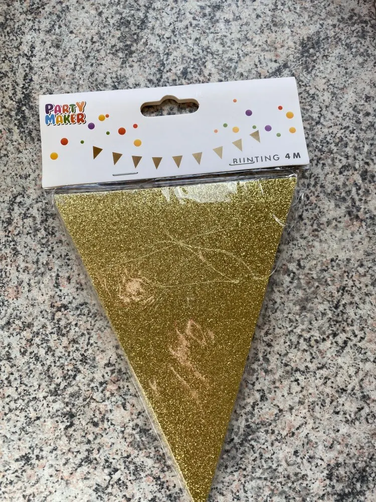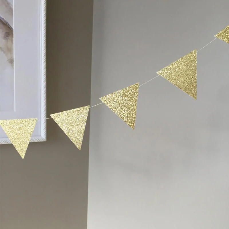 Название производства: флажки с золотыми блестками Место происхождения: Китай Повод: День рождения, свадьба, украшения вечерние, праздник и так далее Спецификация: 1 шт./упак. 4M Цвет: как на фото