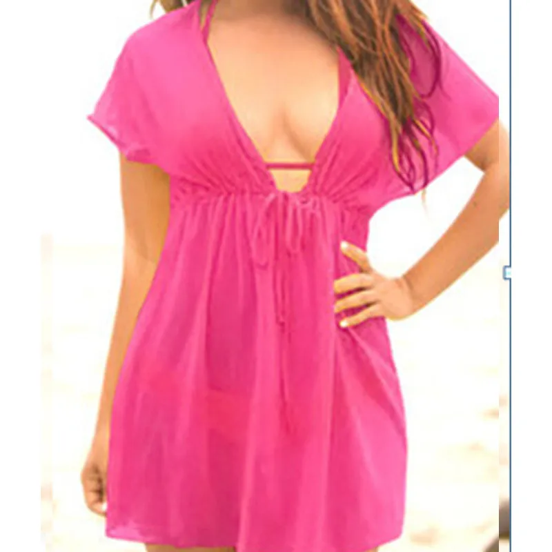 Женское пляжное платье-саронг, однотонное повседневное пляжное платье с коротким рукавом и V-образным вырезом, накидка мини, 2021