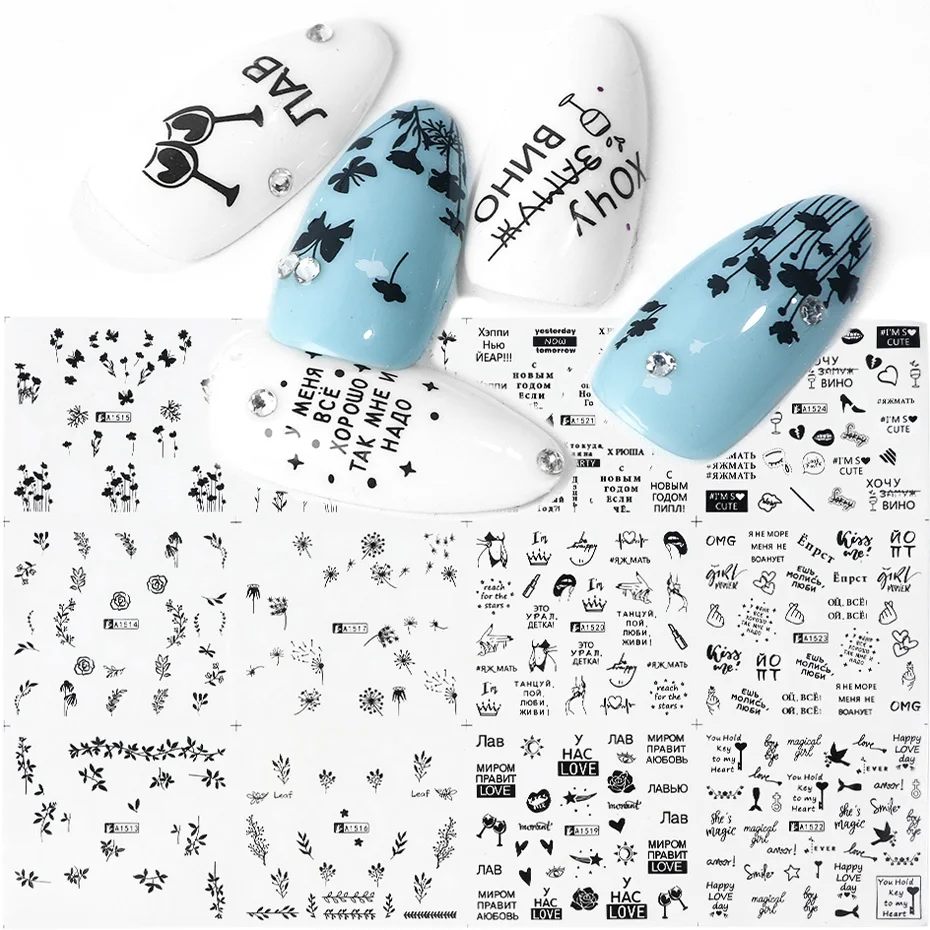 Переводные наклейки для ногтей, с листьями, черные буквы, украшения из фольги, TRA1513-1524-1, 12 шт.