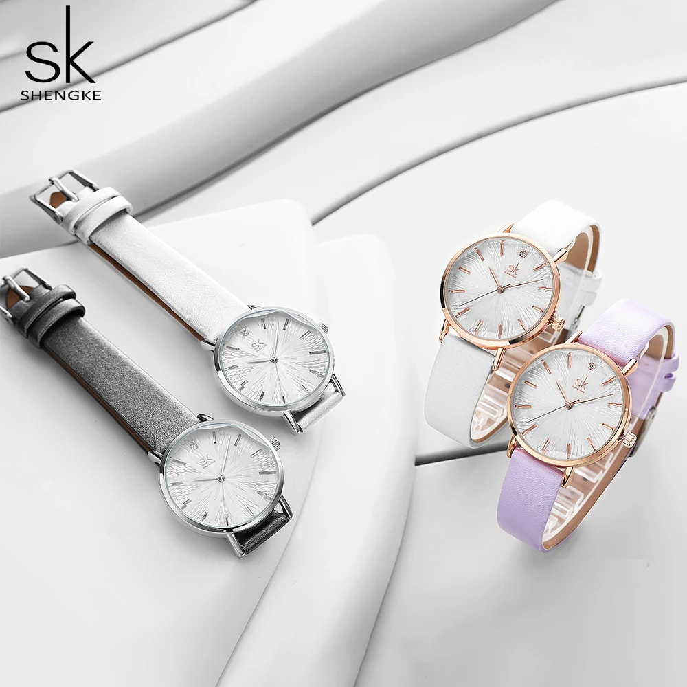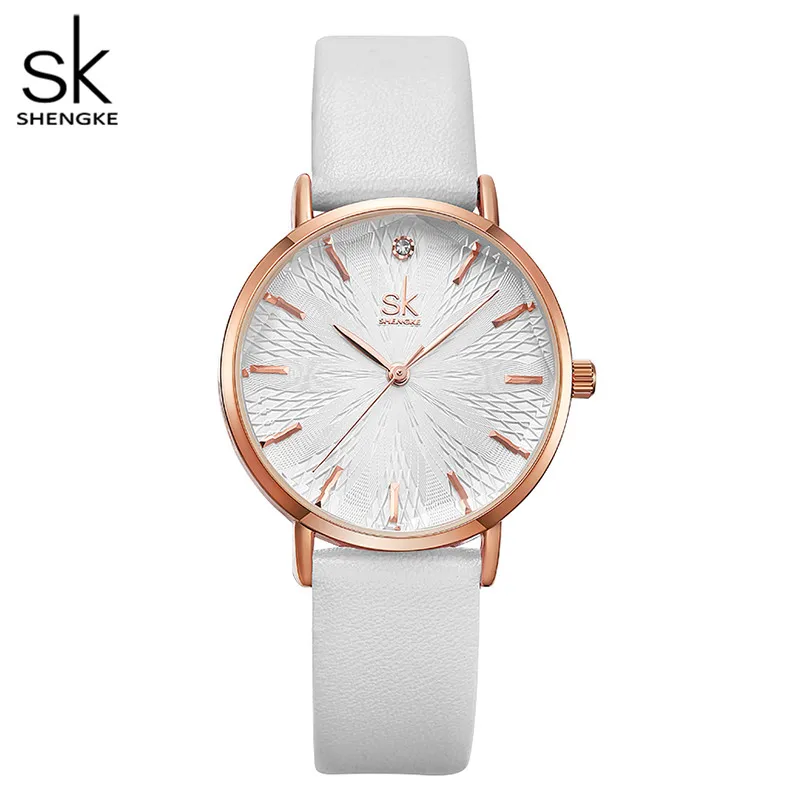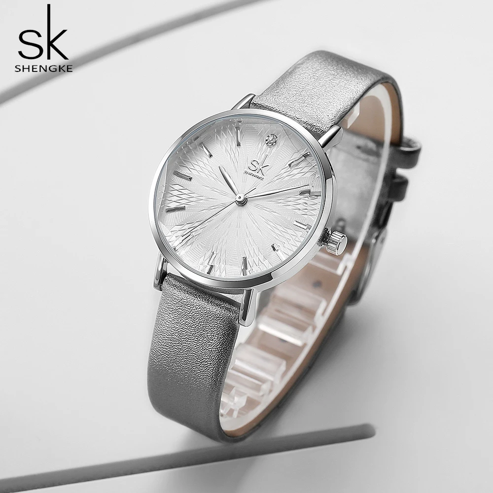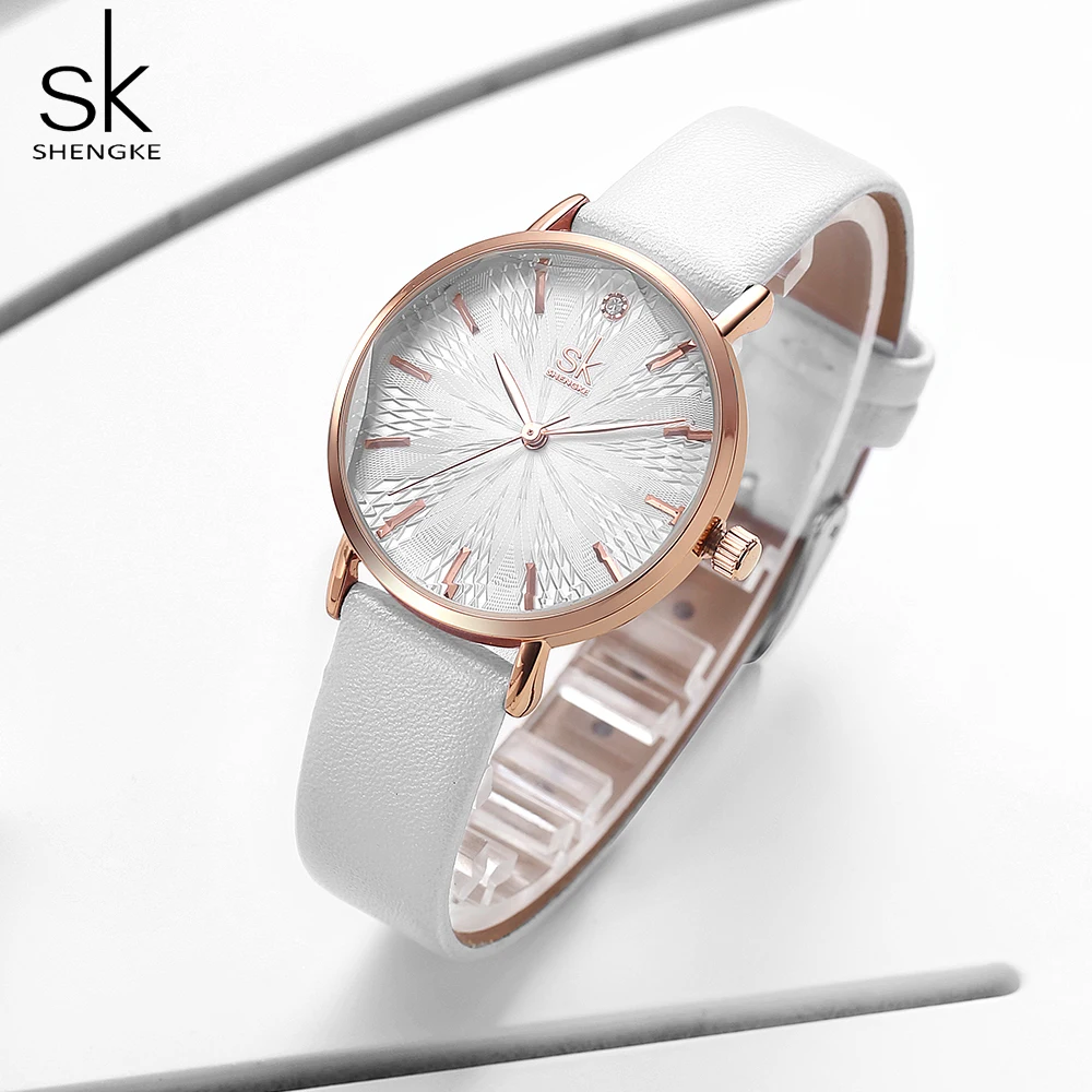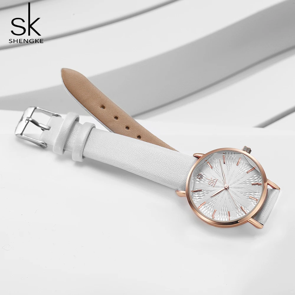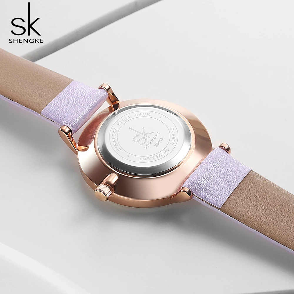 Часы наручные Shengke женские кварцевые, модные повседневные аналоговые круглые, с кожаным ремешком, элегантные