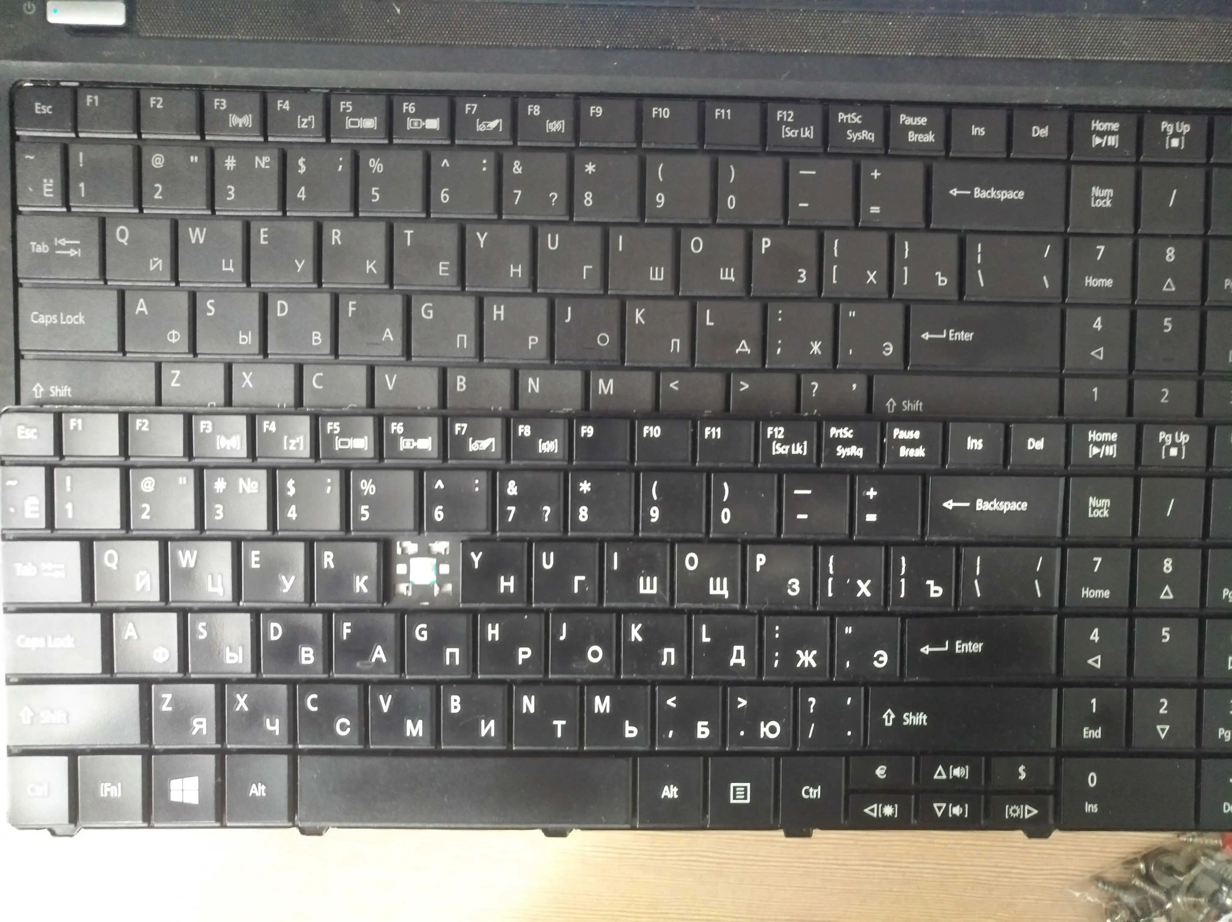 Клавиатура шла 39 дней. Вид установленной клавиатуру на первом фото. Начну с минусов, надписи на клавиатуре заметно гораздо темнее чем на оригинале, шрифт английских букв такой же как на оригинале но на оригинале он жирнее, русские буквы используется другой шрифт и почему то буквы очень маленькие по сравнению с оригиналом. Всё это хорошо видно на втором фото где прямое сравнение с оригиналом и клавиатурой продавца. Соответственно продавец лукавит выставляя фото оригинала в объявлении.