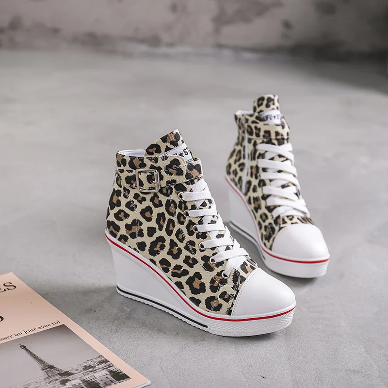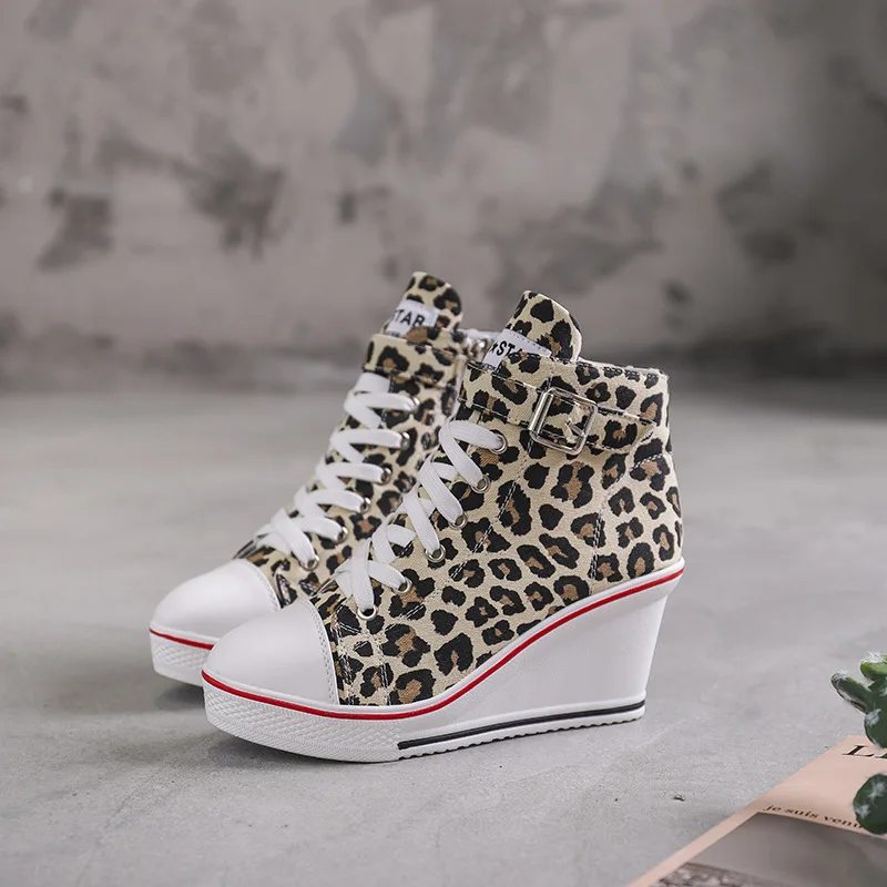 Новинка 2019 года; леопардовые женские кроссовки; повседневная обувь на танкетке; женская обувь из вулканизированной кожи на шнуровке; сезон осень; обувь, увеличивающая рост; женские кроссовки