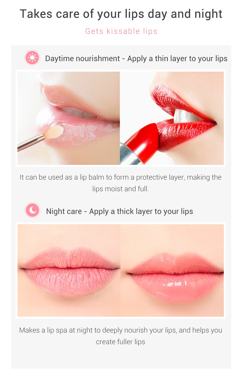 Содержит натуральный экстракт розы, супергидрат, улучшает кожу непрозрачных губ, маскирует омертвевшие губы, уменьшает линии губ, увлажняет цвет губ и восстанавливает губы во время сна.